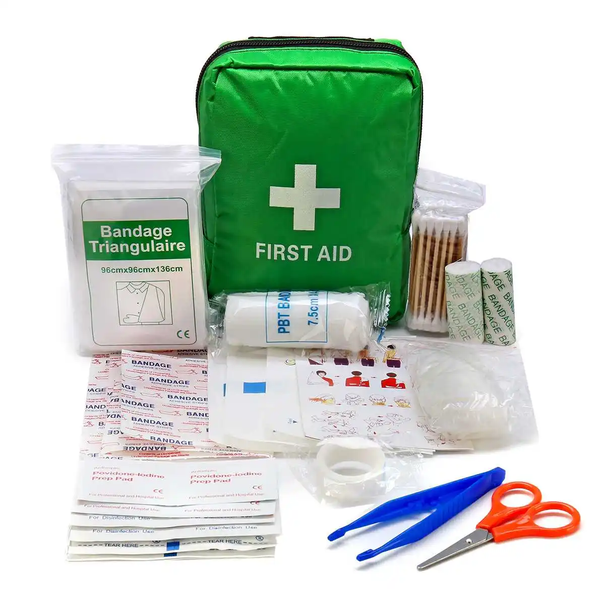 Посылка включает в себя:1 x зеленый пакет первой помощи1 x ножницы (9 см)1 пластиковый пинцет1 x эластичный бандаж из ПБТ (4,5 см * 7,5 м)1 x клейкая повязка14 x клейкие ленты для стипсиса4 x Povidone-lodine Preps Pad10 x спиртовой коврик1 х бандажный триангулер (96 см * 96 см * 136 см)2 x Gauzw тампон1 х одноразовые перчатки из ПВХ (1 пара)Универсальный бандаж-2 шт.1 x клейкая повязка на рану80 х хлопковая палочка1 x Руководство пользователя