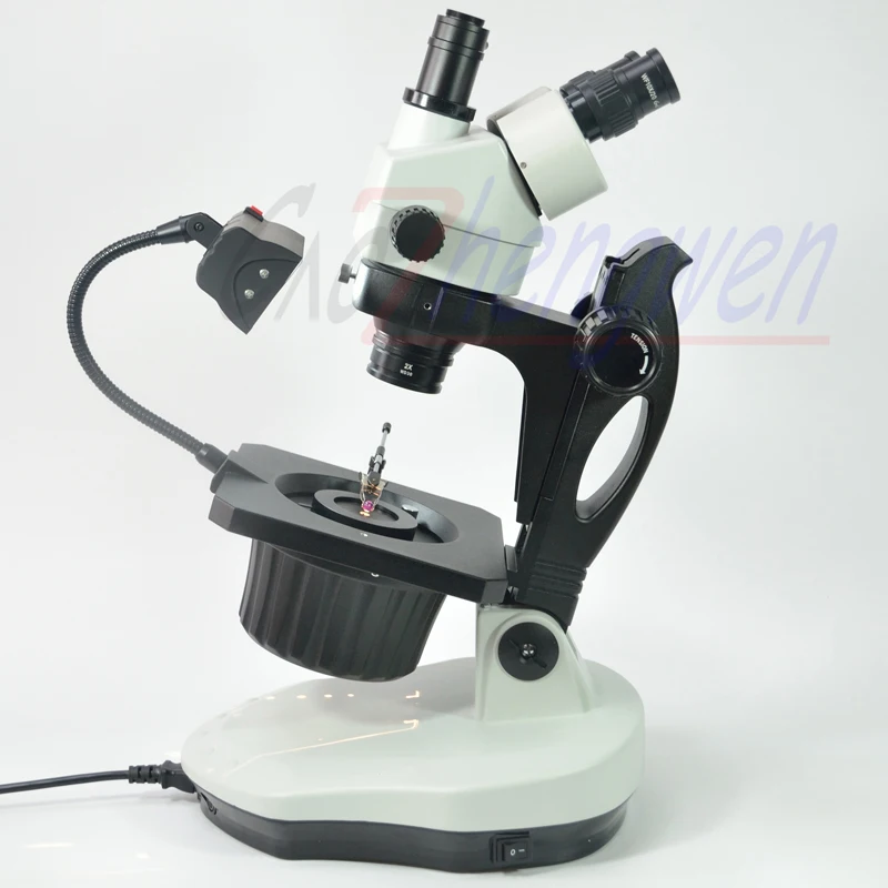 Этот высококачественный микроскоп предназначен для профессиональных ювелиров и гемологов. Он включает в себя 7X-45X super widefield zoom стерео микроскоп головка, 3D ювелирные изделия/драгоценный камень зажим (пинцет), вращающийся круглый этап с фильтром darkfield iris конденсатор и профессиональный драгоценный камень стенд.