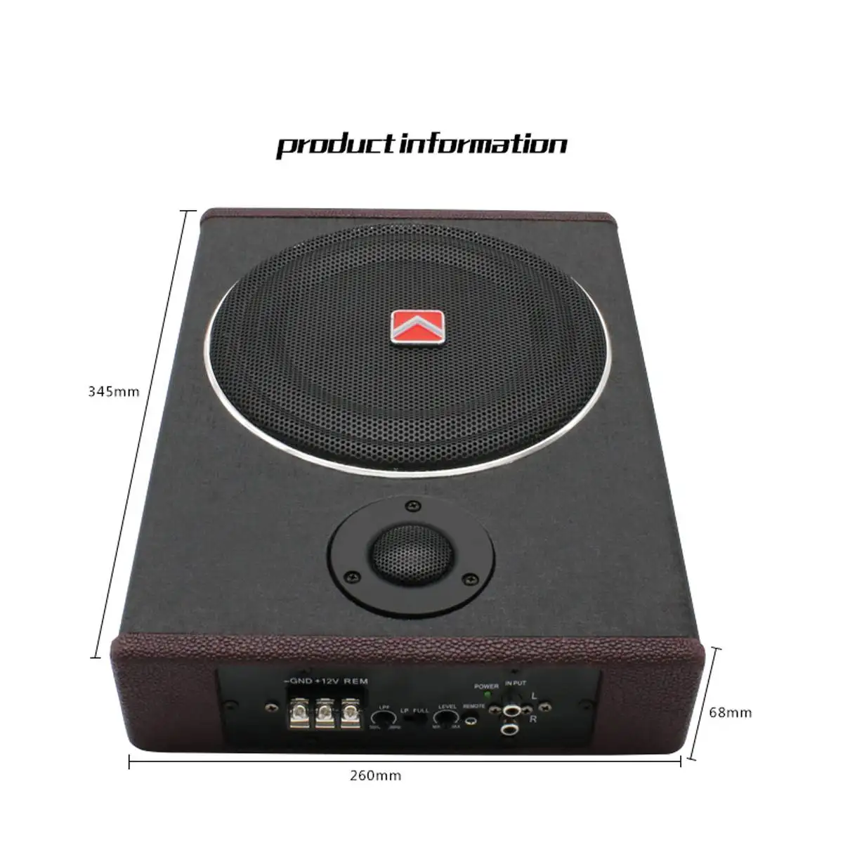 Особенности1. Супер тонкий активный сабвуфер 8 дюймов с усилителем2. Оснащен входами уровня RCA/динамика, может быть легко интегрирован с помощью существующих подключений динамиков3. С обеих сторон расположено множество радиоактивных отверстий, чтобы обеспечить теплоотдачу и избежать перегорания звуковой коробки.4. Деревянный корпус для минимизации вибрации, вызванной шумом, гарантирует, что в течение длительного времени высокая производительность нагрузки в окружающей среде стабильна и надежна.