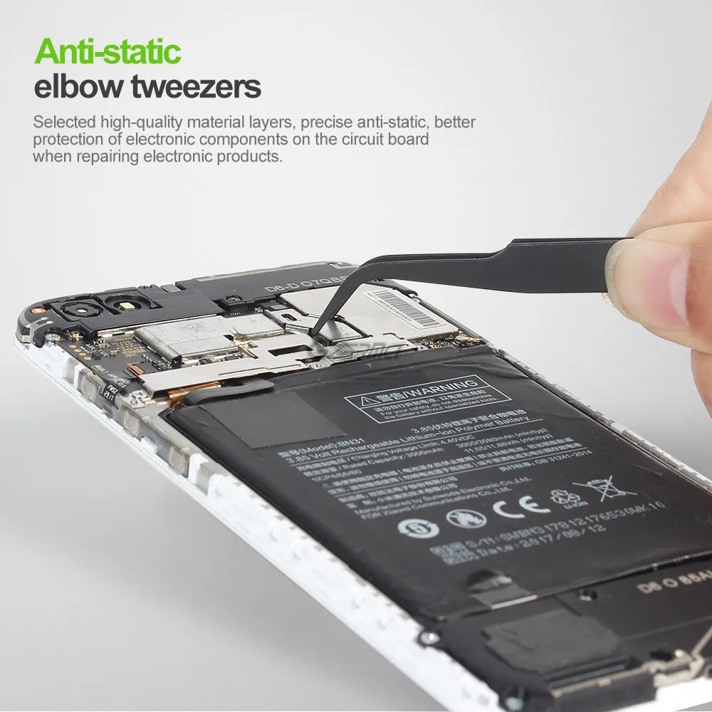 Пинцет изготовлен из металла и пластика. Он имеет острый конец разных размеров и может войти в зазор, что подходит для многих ремонтных работ.