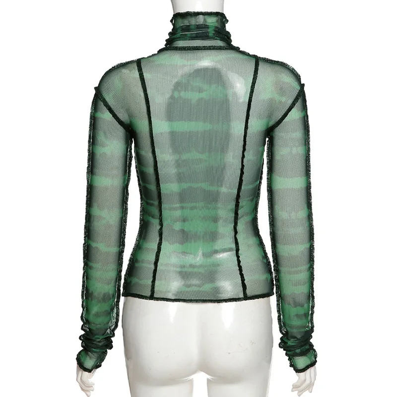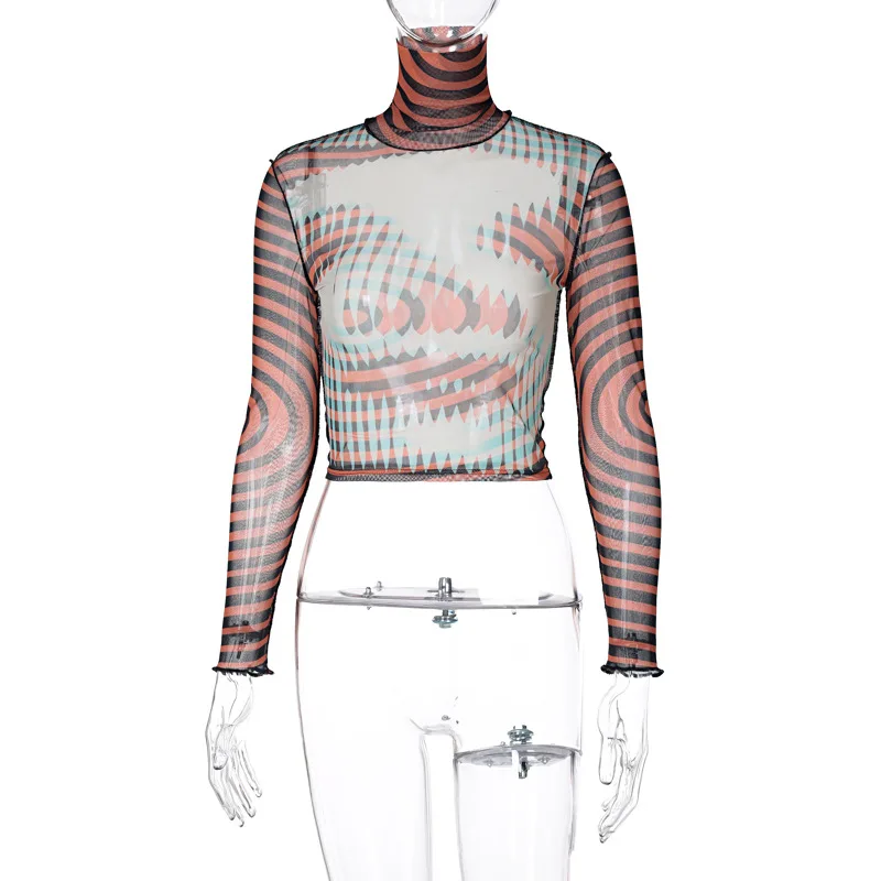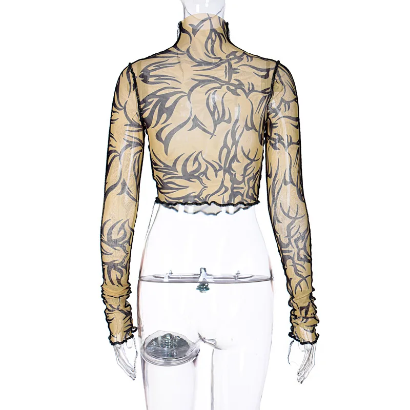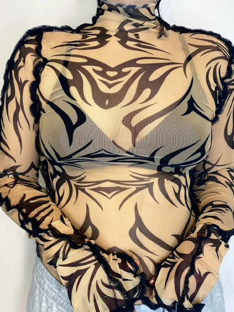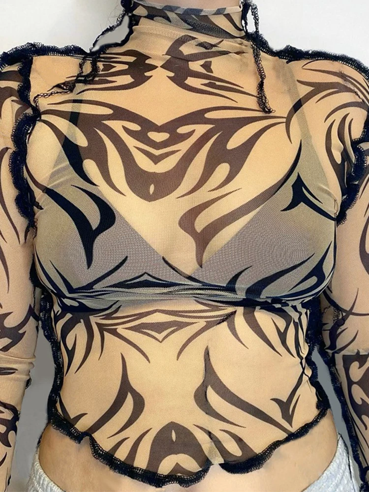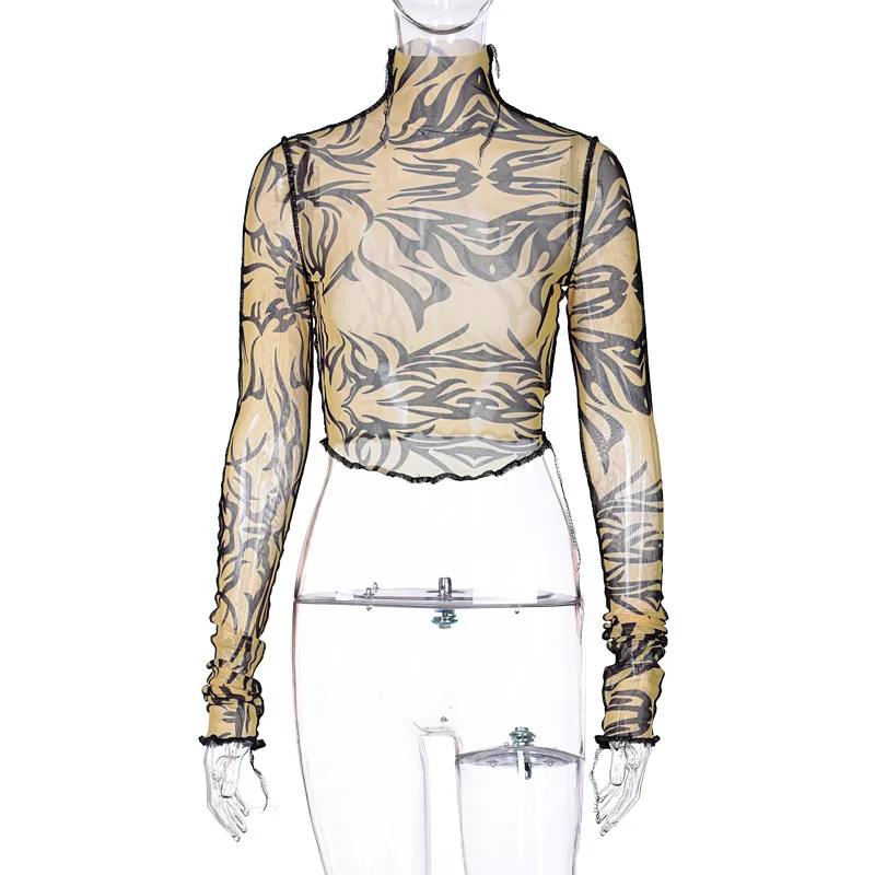 Сетчатый топ Y2K, укороченный Топ с длинным рукавом, водолазка, футболка с вышивкой, сексуальная Просвечивающая аниме футболка, Клубные топы с принтом, одежда Феи гранж