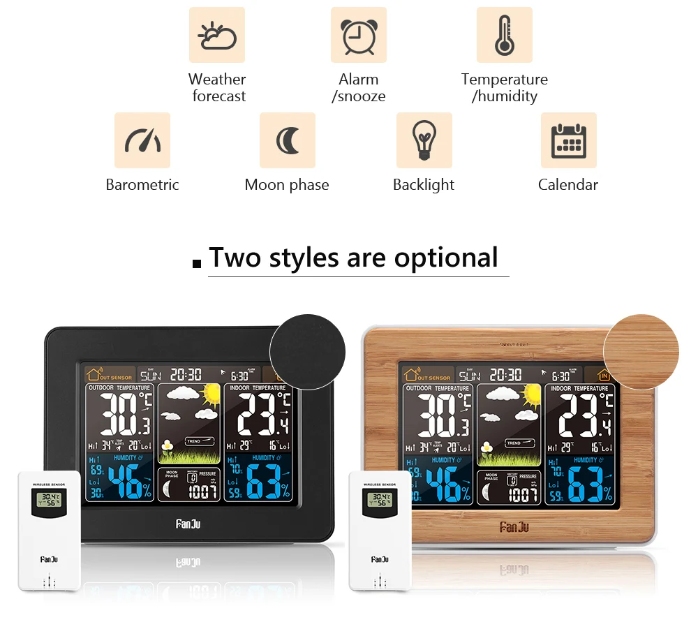 FanJu FJ3365 многофункциональная цифровая метеостанция с будильником. С цветным ЖК-экраном, термометром и гигрометром он может отображать атмосферное давление, а Прогноз погоды прогнозируется атмосферным давлением. Поддерживая один беспроводной датчик, вы можете разместить датчик на улице или в другой комнате. Работайте с питанием от USB, независимо от того, находитесь ли вы в Европе, Америке или Океании. Современный минималистичный дизайн-отличный аксессуар и инструмент.