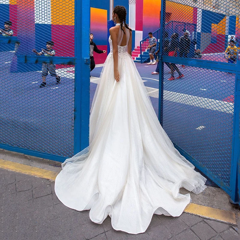 Платье свадебное с V-образным вырезом, открытой спиной и блестками