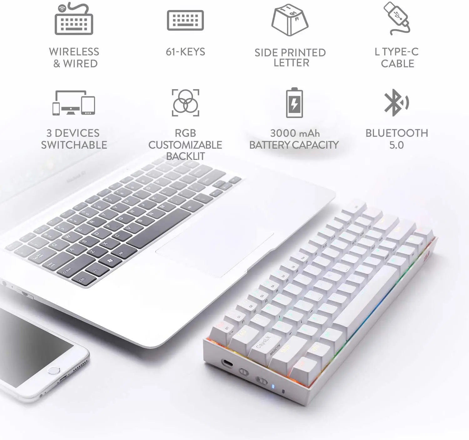 Ультра минималистичный дизайн tenkeyless (TKL) с 61 клавишей портативная компоновка освобождает место на столе для перемещения мыши, что обеспечивает самую высокую производительность для FPS pro.