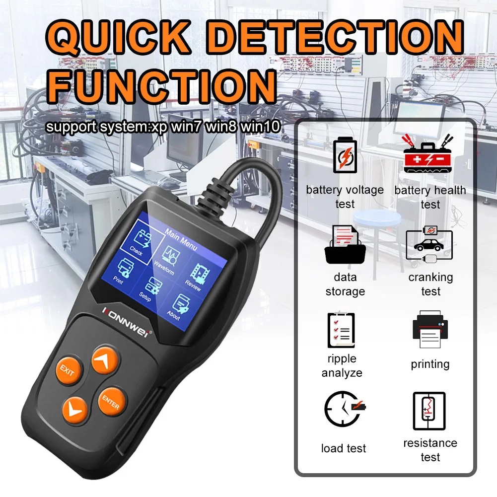 * 12. Применение: используется для тестирования широкого диапазона батарей 12 В (начиная {SLI}, глубокий циклический и морской) влажных (затопленных), VRLA или без обслуживания (MF), герметичный без технического обслуживания (SMF), абсорбирующий стеклянный коврик (AGM), EFB и гелевая клетка.