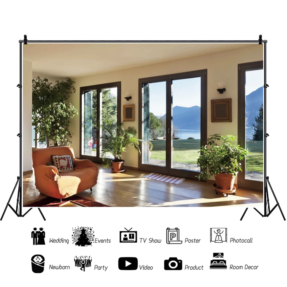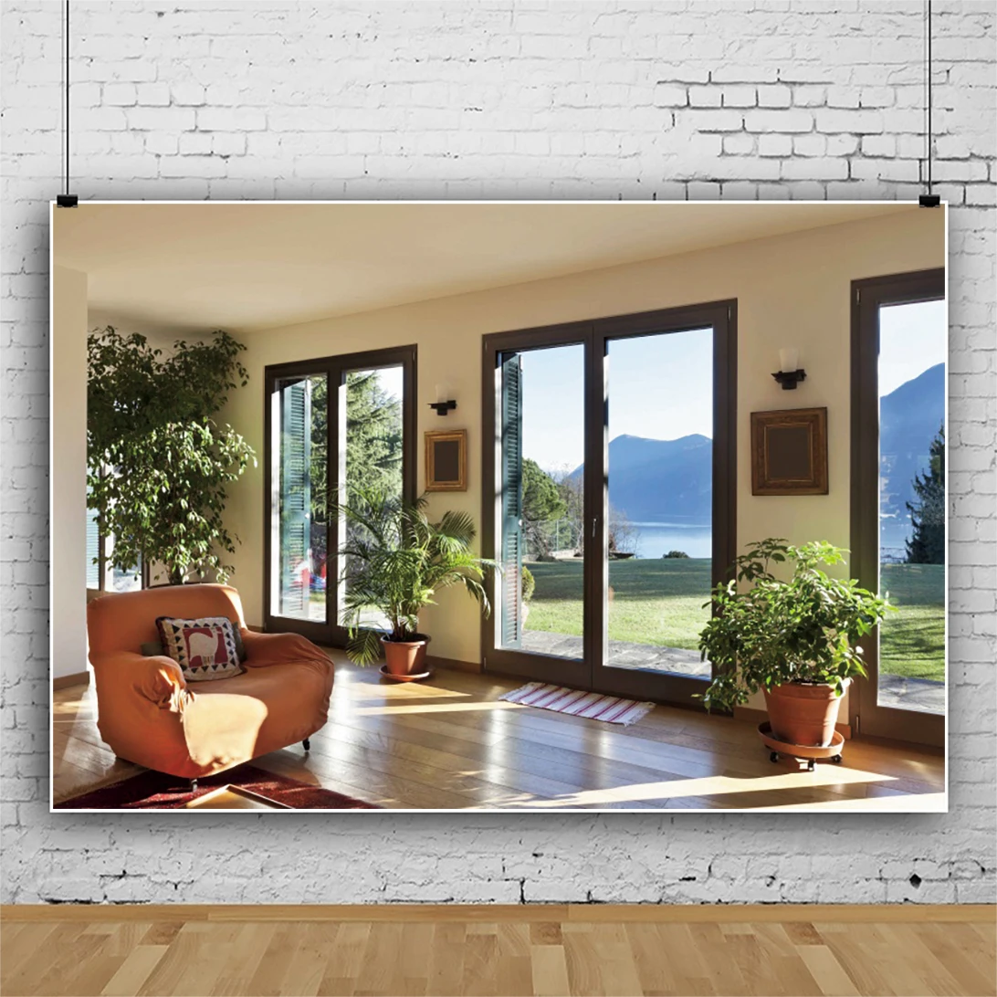 Фон для фотосъемки с изображением французского окна уютного Дома Офиса фотозона дивана растений интерьера комнаты декорации пола