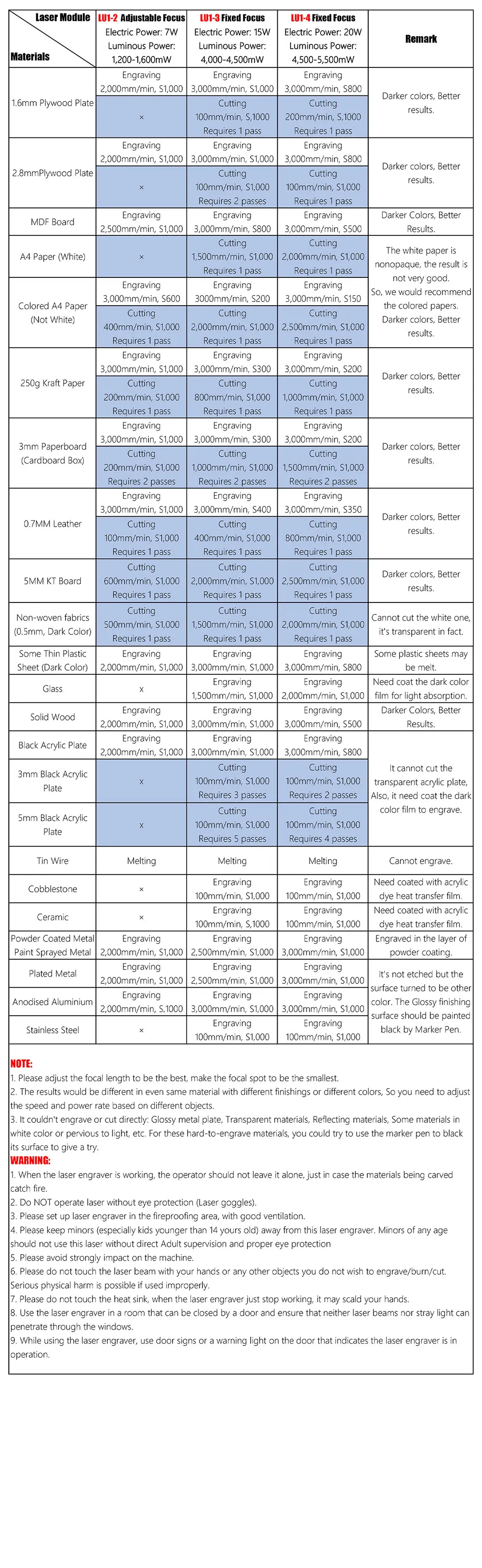 LU1-4 лазерный модуль с фиксированным фокусом 20 ВтХарактеристики:Интерфейс Спецификация: 20 Вт лазерной головки: HY2.0, 4Pin терминал (3-жильный кабель в сочетании с один негативный пустой порт, красный, защита от перегрузки: VCC, черный: GND, белый: PWM +).Объектив: φ6/стеклоПоложение привода: 20 Вт: внешнийРегулируемая мощность: ШИМ регулируетсяДиапазон фокусировки: 20 Вт: 19 ммФокусное расстояние от производителя (регулируемое): 20 Вт: 55 мм от розетки (светильник снизу радиатора)Защита привода: Защита от перенапряжения, защита от перенапряжения.Входное напряжение: 12 ВВходной ток: 20 Вт: 2,1 аУстановка линии управления: подключаемыйВентилятор: 20 Вт: 12 В 0.15A 4020 вентиляторСкорость вентилятора: 10000 об/минРабочая температура: от-20 ℃ до 70 ℃