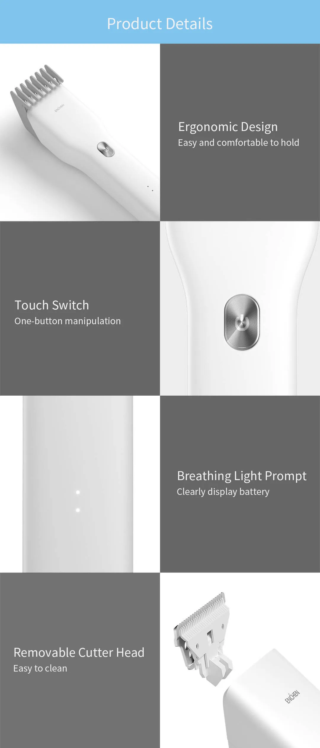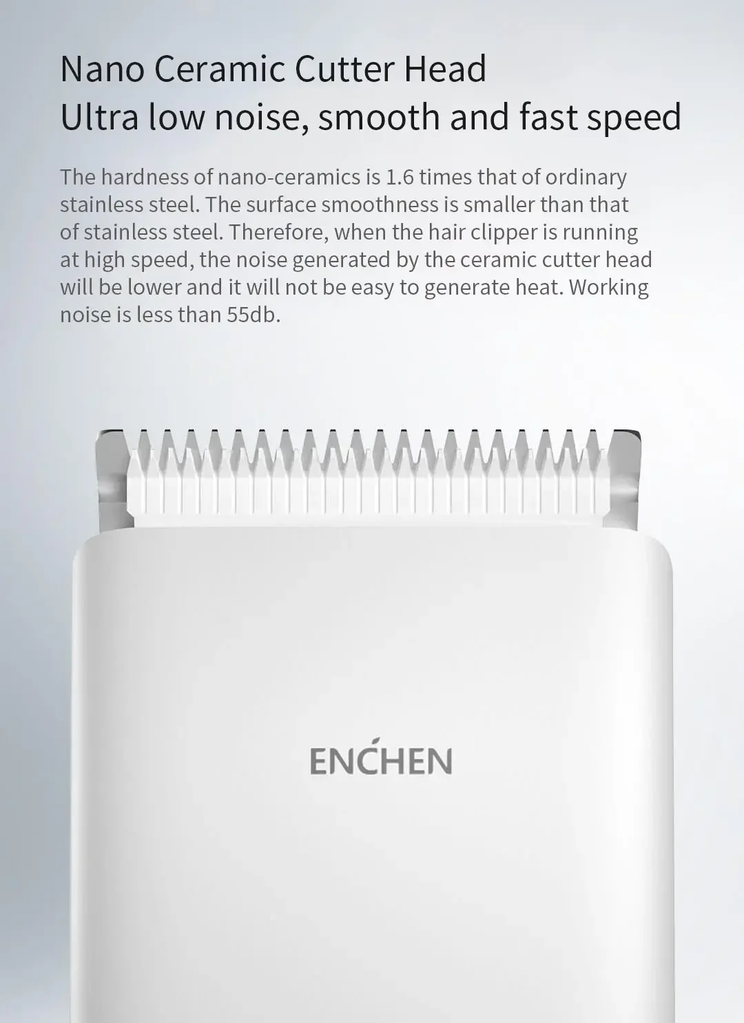 -ESM Intelligence предотвращает появление волосESM (Energy Smart Manager) является мозгом продуктов ENCHEN. Он имеет два больших модуля управления энергией и мастеринга двигателя, которые могут гарантировать высокоскоростную работу и отсутствие ворса при низком заряде батареи. Во время процесса зарядки ESM активирует несколько гарантий для продления срока службы батареи и обеспечения безопасной зарядки. Кроме того, система индикатора Boost может точно отображать состояние низкого заряда батареи, зарядки и полной мощности. -Обработка округлых углов типа RЧасти, которые контактируют с кожей с режущей головкой и расчески позиционирования, округлены для обеспечения безопасности и комфорта во время стрижки волос. Головка для стрижки волос состоит из подвижного резака и статического резака. Он может безопасно связаться с режущей головкой под любым углом во время рабочего процесса.