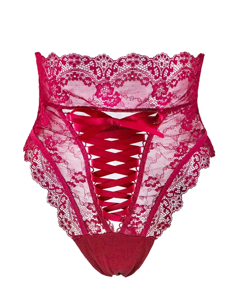 Сексуальный кружевной комплект с бюстгальтером, нижнее белье, кружевные атласные прозрачные трусики на шнуровке с завышенной талией, трусики