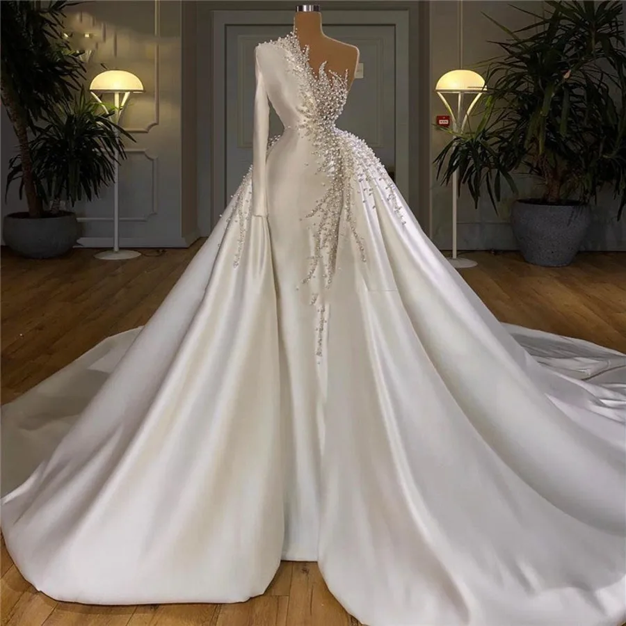2020 Новинка, тяжелый жемчуг на одно плечо, свадебное платье расшит...