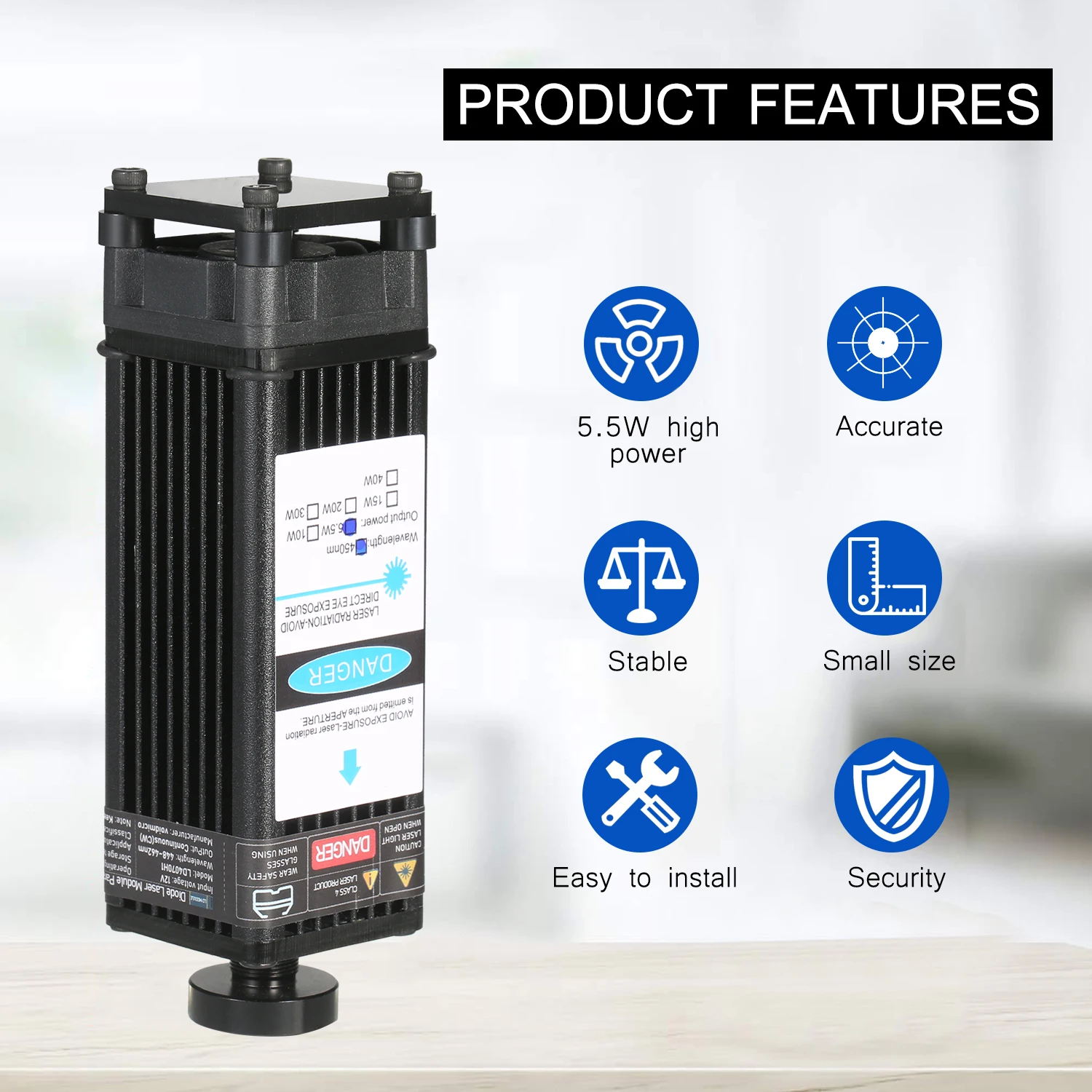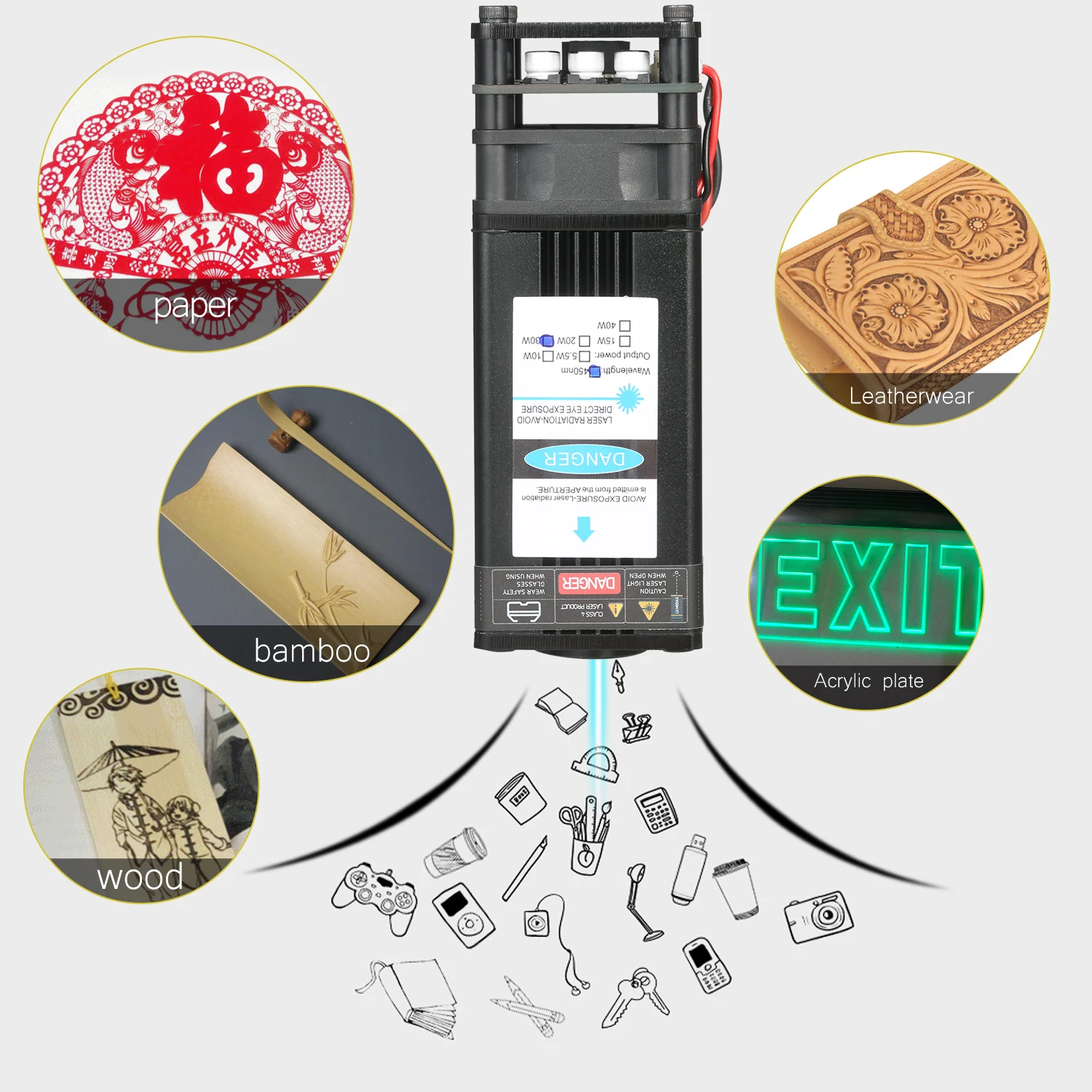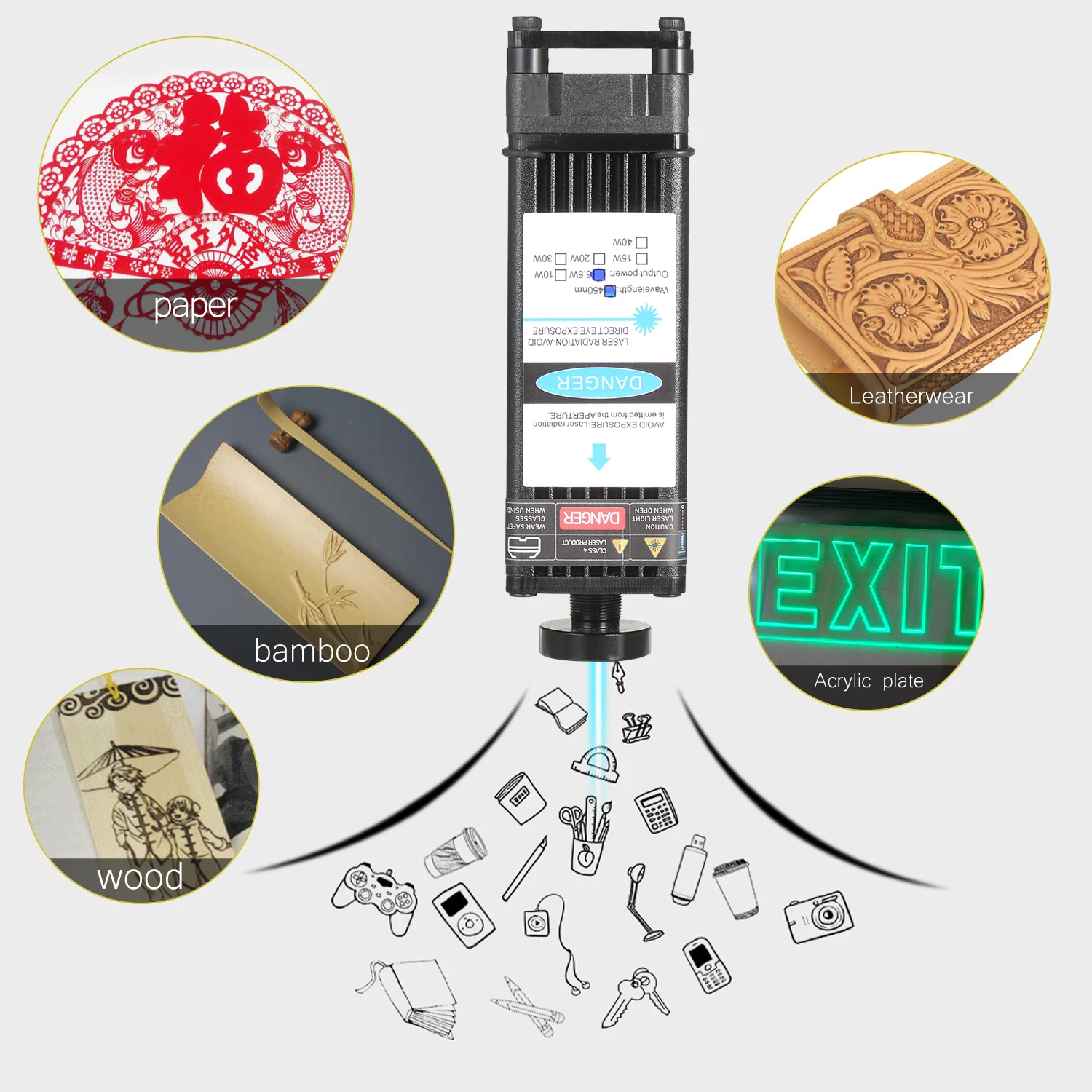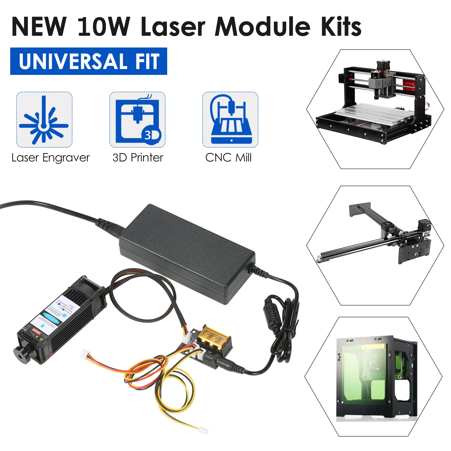 В комплект лазерного модуля «сделай сам» входит плата адаптера для 3 входных методов с кабелем TLL и 3-контактным кабелем, который универсально подходит для всех устройств для лазерной гравировки, 3D-принтера и фрезерного станка с ЧПУ. С длиной волны 450 нм, это эффективный инструмент для лазерной гравировки и лазерной резки. Есть 5 мощных лазерных модулей на выбор, они могут гравировать и разрезать разнообразные материалы. Особенности: Комплект лазерного модуля Universtal-посылка комплект входит лазерный модуль, плата адаптера метода ввода 3, кабель 2 Pin и 3 pin, блок питания и шнур питания. Плата адаптера 3 интерфейса и 2 кабеля предназначены для лазерного гравера, 3D-принтера, Фрезы с ЧПУ. Вы можете свободно использовать наш лазерный модуль в разнообразной раме. Обновление голубого лазерного модуля -- обновление профессионального лазерного модуля с меньшими потерями и высокой точностью, при этом высокая скорость, высокая стабильность и длительный срок службы. Яркий сине-фиолетовый светильник, точное Пятно без бродсветильник, легко определить местоположение при гравировке. Фиксированный фокус-поставляется с дополнительным фокусным кольцом, помогающим выравнивать расстояние гравировки между лазерным модулем и резьбовыми предметами. Легко собирается безопасное использование-маленький и компактный, удобный и простой в установке. Поставляются с защитными очками, обеспечивают безопасность рабочего процесса. 40 Вт резьбовой материал-он может гравировать 201/304 нержавеющей стали, титановой стали и анодированного алюминия, камня, МДФ, бальзы, дерева, ткани, пластика, печатных плат, бумаги, бамбука, рога, кожи, губчатая бумага и т. д. Не гравируется: медь ra w Материал s, алюминий ra w Материал s. 40 Вт режущие материалы-резка фанеры, резка черной акриловой доски, кожи, бумаги и т. д. Спецификация: Вилка: ЕС/США/Великобритания/Австралия (опционально) Мощность лазера: 5500 МВт/10 Вт/20 Вт/30 Вт/40 Вт (опционально) Материал: алюминиевый сплав + пластик Цвет светильник: сине-фиолетовый Входное напряжение: 12 В Длина волны: 448-462nm Форма затычка: кнопка, регулируемый фокус (30 Вт не может регулировать фокусировку) Источник питания: Вход: AC 100-240V 50-60Hz Выход: 12 В 6А Комплектация: 1 * лазерный модуль 1 * комплект аксессуаров для установки 1 * вспомогательная фокусировка 1 * конверсионная плата 1*2 контактный шнур 1*3 контактный шнур 1 * очки 1 * блок питания 1 * шнур питания