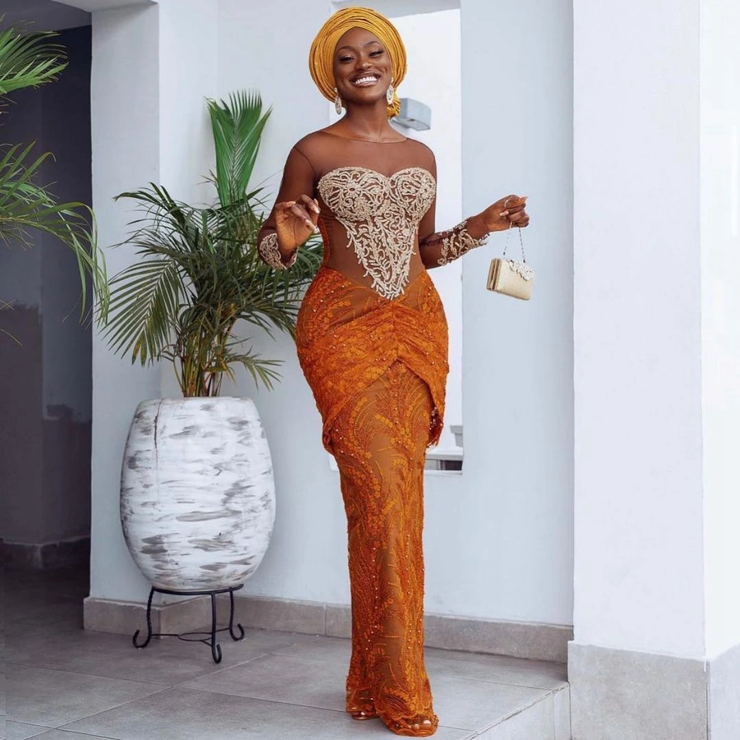 Оранжевые вечерние платья-русалки длиной до пола с длинными рукавами и бисером, сделанные на заказ сексуальные прозрачные платья для выпускного вечера