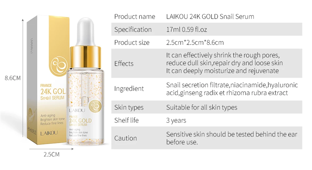 Название продукта: LAIKOU 24K Золотая сыворотка улитки Параметры: 17 мл 0,59 fl.oz Размер изделия: 2,5 см * 2,5 см * 8,6 см Эффекты Он может эффективно сокращать грубые поры, уменьшать тусклую кожу, восстанавливать сухую и свободную кожу. Он может глубоко увлажнять и омолаживать Ингредиент Фильтрат секреции улитки, Ниацинамид, гиалуроновая кислота, экстракт женьшеня и ризомы Типы кожи: подходит для всех типов кожи Срок годности: 3 года Предостережение Перед использованием следует проверить чувствительную кожу за ухом.