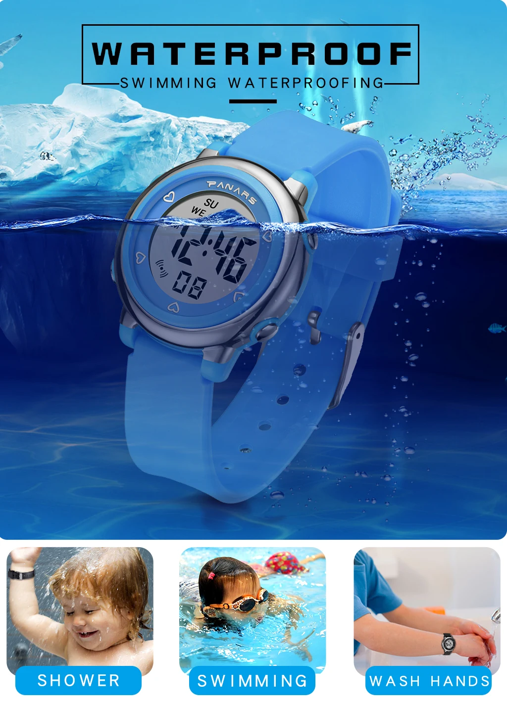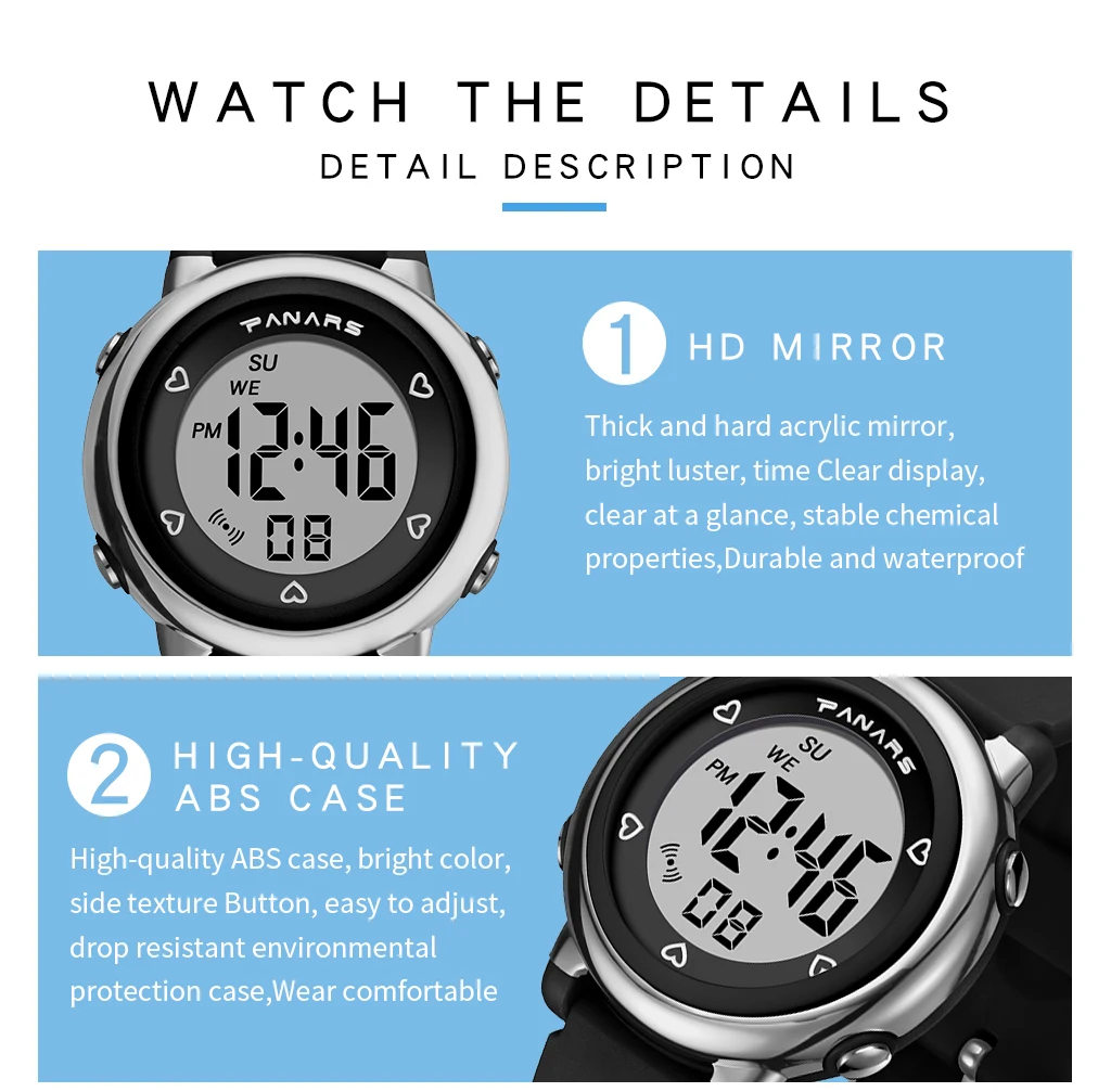 Часы электронные для мальчиков и девочек, водонепроницаемые, 5 АТМ,...