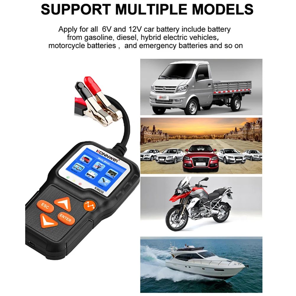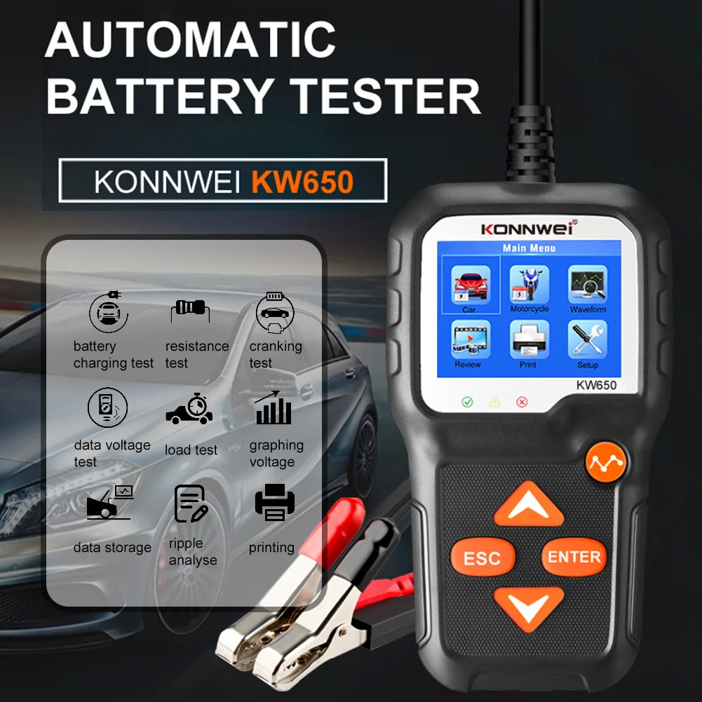 Тестер автомобильных аккумуляторов KONNWEI для мотоциклов, 6 в, 12 В, 100-2000 CCA