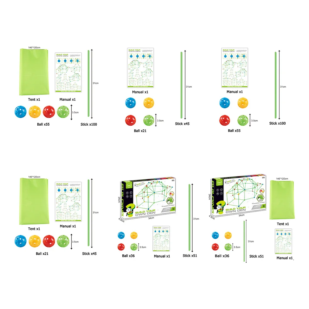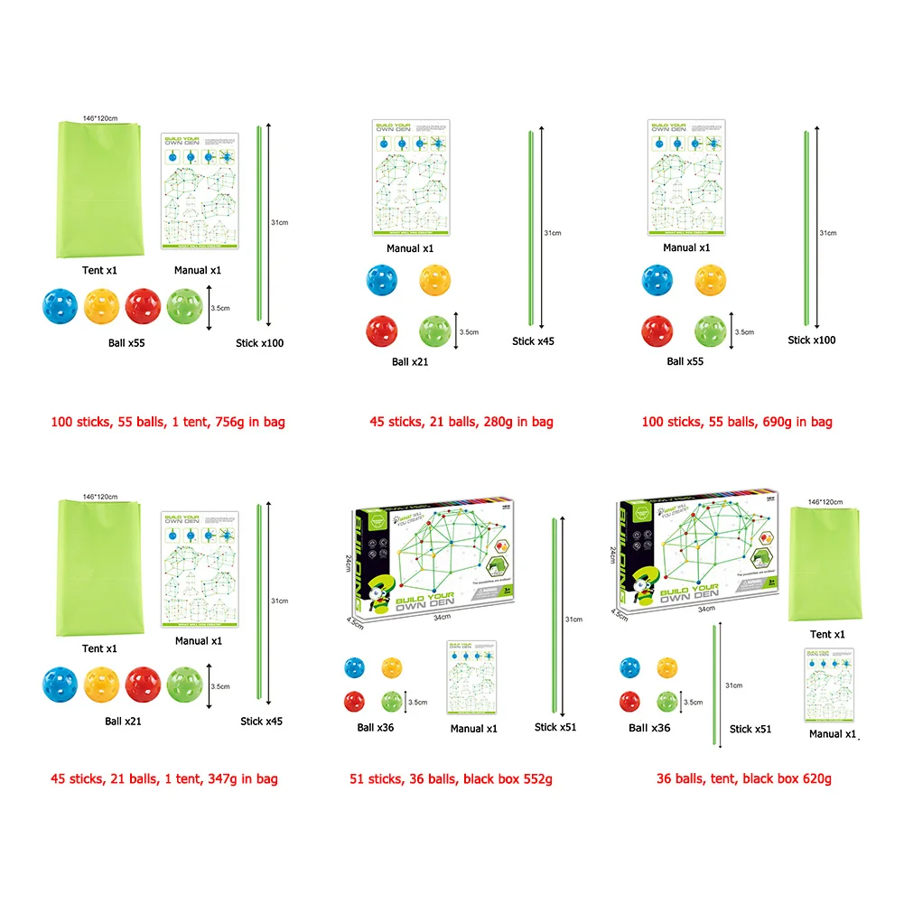 Тип: A (100 штанг + 55 шаров + палатка для упаковки сумок), B (100 штанг + 55 шаров для упаковки сумок), C (45 штанг + 21 шар для упаковки сумок), D (45 штанг + 21 шар + палатка для упаковки сумок), E (51 стержень + 36 шаров-8812 черная упаковка), F (51 стержень + 36 шаров + палатка-8812 черный пакет)