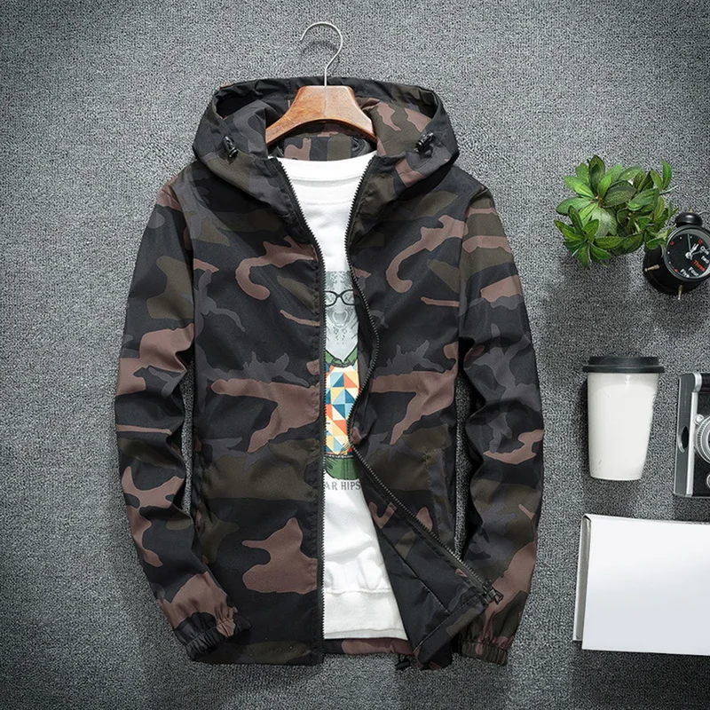 Куртка мужская камуфляжная на молнии, Повседневная приталенная, ветровка с капюшоном, модная уличная одежда, весна-осень