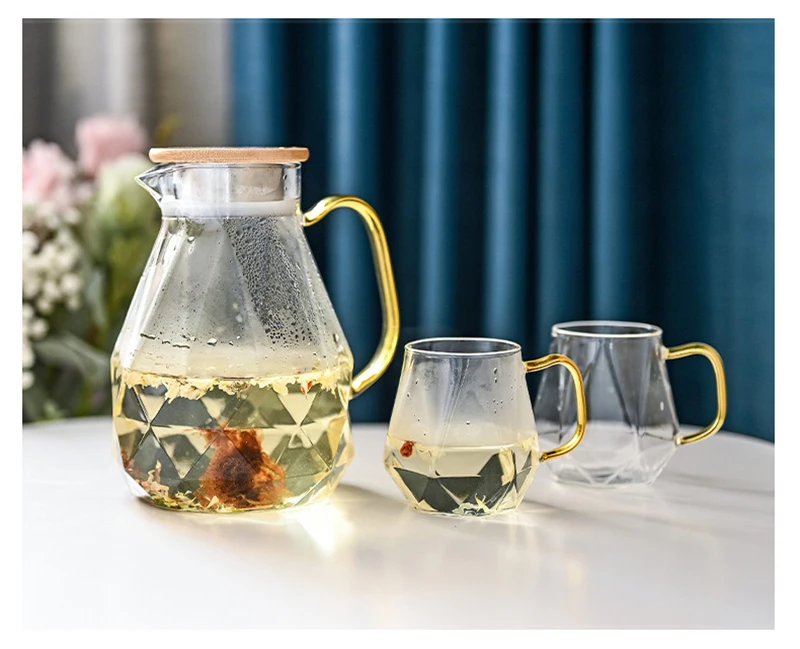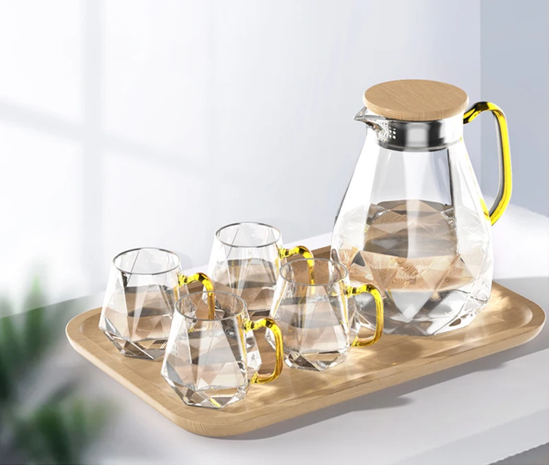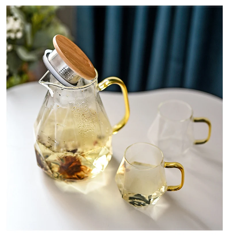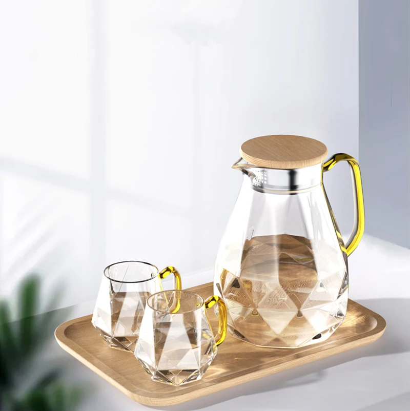 Стеклянный кувшин для воды с алмазным узором, прозрачный домашний графин, термостойкий чайник для горячей и холодной воды с бамбуковой деревянной крышкой