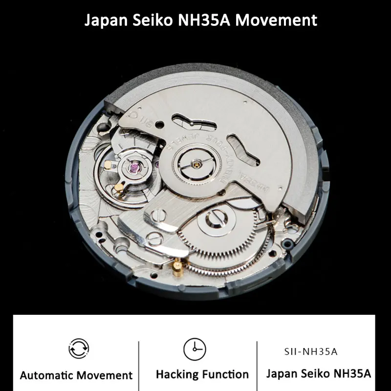 -- Механизм: Japan Seiko original 24 jewels NH35 механический автоматический механизм.-- Материал корпуса: нержавеющая сталь 316L.-Чехол: 20 АТМ (200 м) водонепроницаемый-- Чехол Размеры: 39 мм диаметр; 12,2 мм толщина-- Стекло: сапфировое стекло-Циферблат: черный циферблат, зеленые стрелки и отметки-Размер ремешка: ширина 20 мм-- Материал ремешка: нержавеющая сталь-- Тип застежки: Застежка-бабочка-- Корона: винт в короне