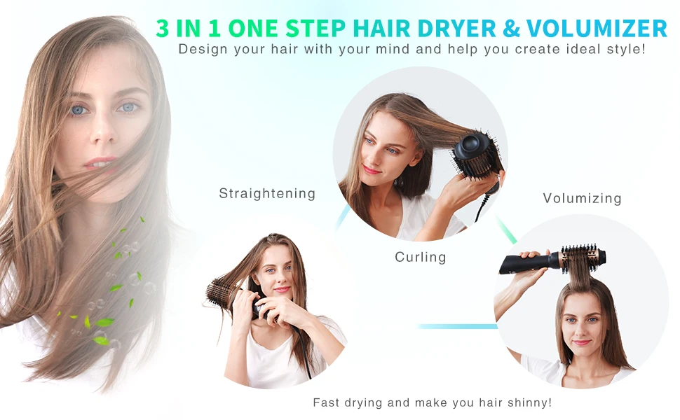 Щетка для сушки волос 3 в 1 1. Фен для волос 2. Выдув испарителя 3. Выпрямитель для волос 4. Бигуди для волос 5. Ионная технология 6. Вращающийся на 360 градусов провод сопротивления