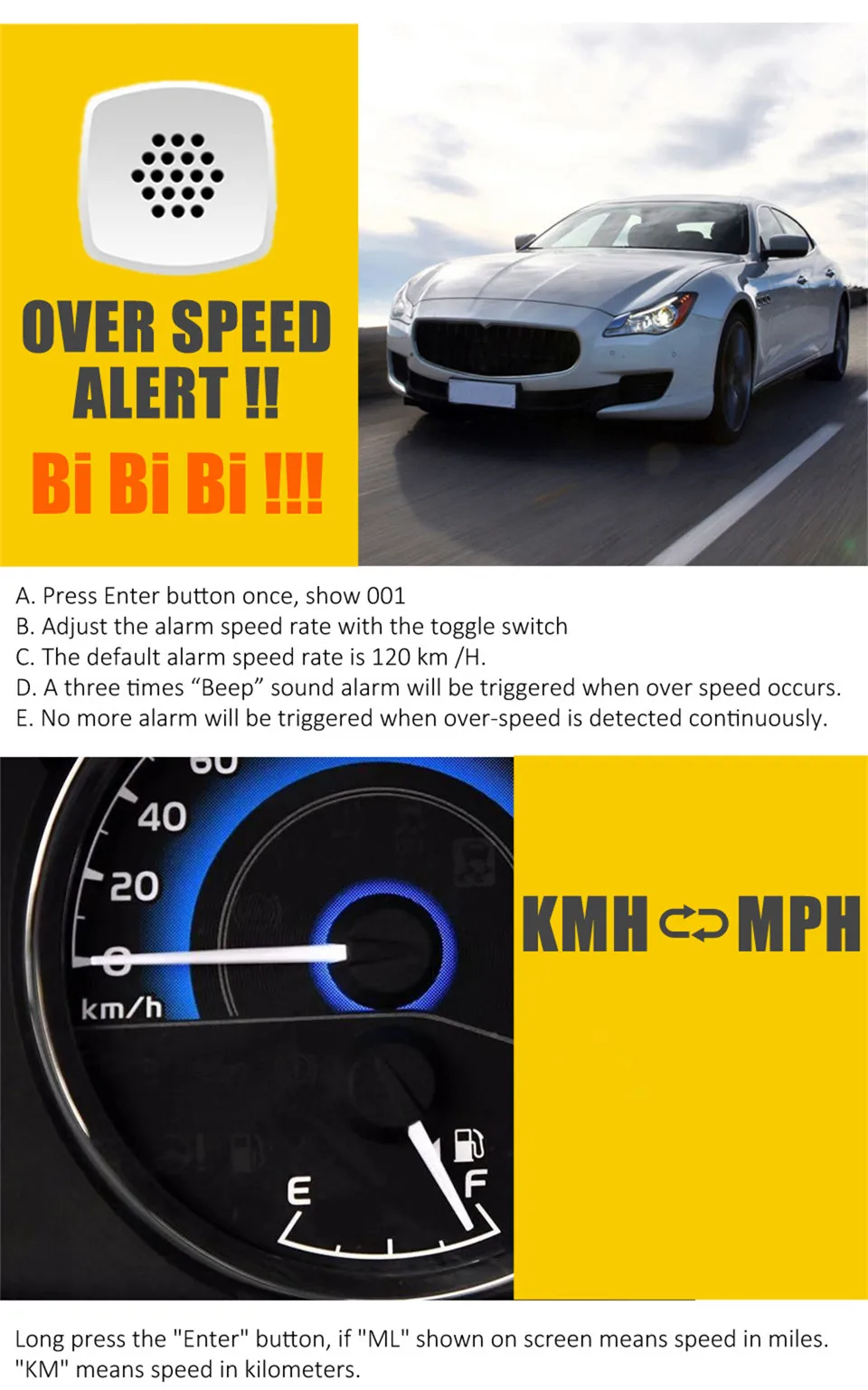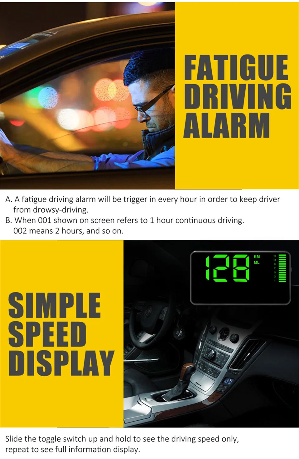 Особенности:1. Безопасное вождение: визуальное время сокращается на 99% от основного направления, и движение глаз может захватить информацию о скорости.2. Легче водить: он может уменьшить частоту регулировки линии зрения, отрегулировать интенсивность направления глазного яблока и уменьшить усталость глаз.3. Пассажирам комфортнее: информация о скорости публикуется, что повышает безопасность и комфорт езды. Требуются такси и специальные автомобили.4. Дисплей более четкий: на жарком солнце или ночью, вы можете выбрать различные положения установки и четко отображать значение скорости.5. Данные о скорости сбора спутников-точные, своевременные и авторитетные.6. Простая установка: внешний источник питания постоянного тока 5 В, внешний маломощный мобильный источник питания также может работать нормально.7. Оповещение о превышении скорости: вы можете установить различные значения скорости оповещения.8. Оповещение об утомляемости: каждый 1 час непрерывного вождения, он будет оповещать 1 раз.9. Единица измерения: быстрое переключение единиц измерения скорости (км/миля) для удовлетворения потребностей различных рынков.10. Статистика пробега и времени вождения: автомобиль автоматически отобразит текущий пробег, текущее время вождения и общий пробег.11. Интеллектуальное управление яркостью дисплея: при ярсветильник яркость дисплея автоматически увеличивается. При слабосветильник яркость дисплея автоматически снижается.Параметры:Наименование: HUD передний дисплей устройства, первоначально система дисплея на военном самолете, пилот может увидеть важную информацию, необходимую на ветровом стекле, не поклоняя головой.Модель: C90Цвет: черныйМатериал: АБС + ПоликарбонатРазмер: около 130*72*18 мм/5,12*2,83 * 0.71inСкорость спутникового позиционирования: от 1 до 3 минут открытого пространства. В комнате нет спутникового сигнала. (дождливые дни влияют на скорость позиционирования спутника)Скорость движения получается спутником.Входное напряжение: 5 В постоянного токаВходной ток: 50 ~ 120 мА, может работать от мобильного источника питанияРабочая температура: -30 ~ 80 градусовДанный блок не имеет встроенного литиевого аккумулятора. При выключении питания сохраняются только общие данные о пробеге. Другие данные не сохраняются.Список:1 * GPS HUD спидометр1 * USB-кабель1 * держатель
