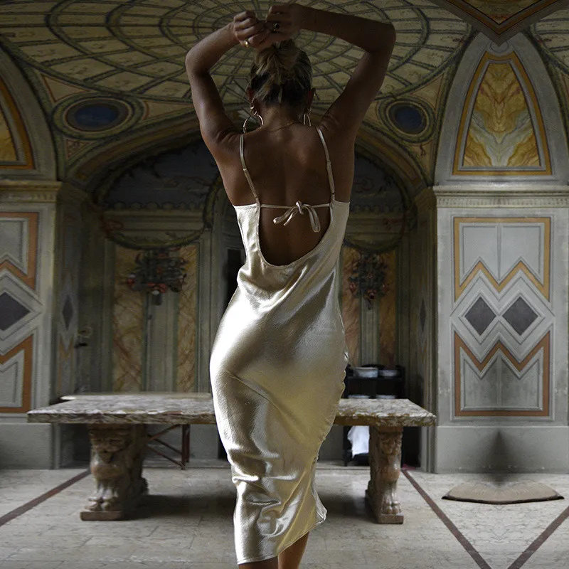 Элегантное платье с открытой спиной, Золотое атласное платье, женск...