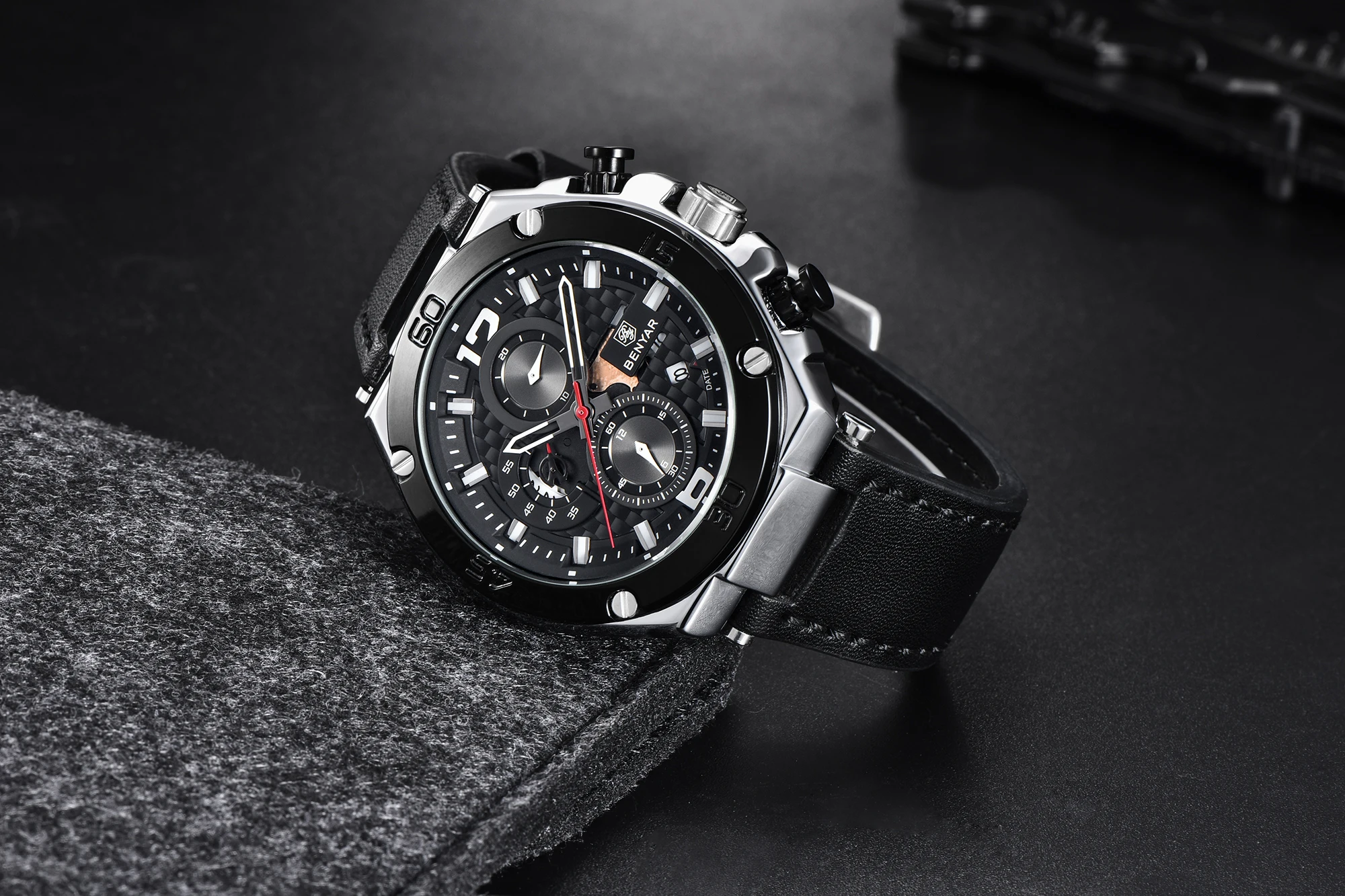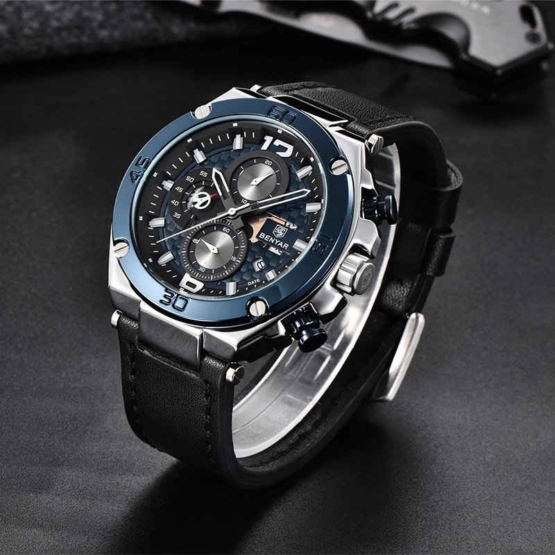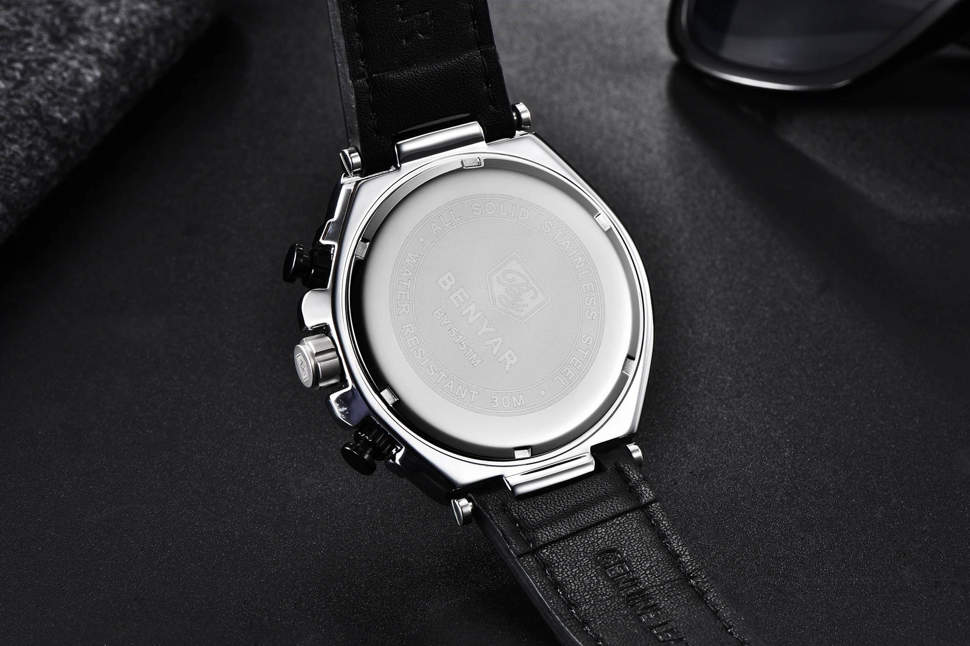 BENYAR Роскошные Брендовые спортивные мужские часы с кожаным ремешк...