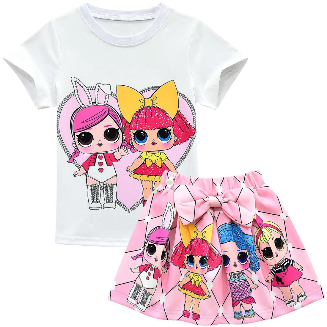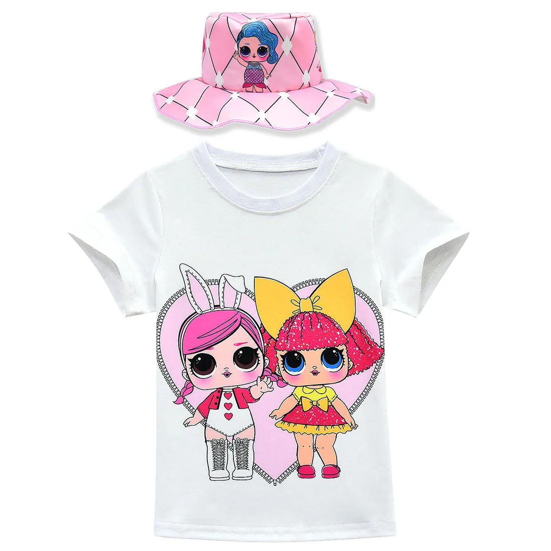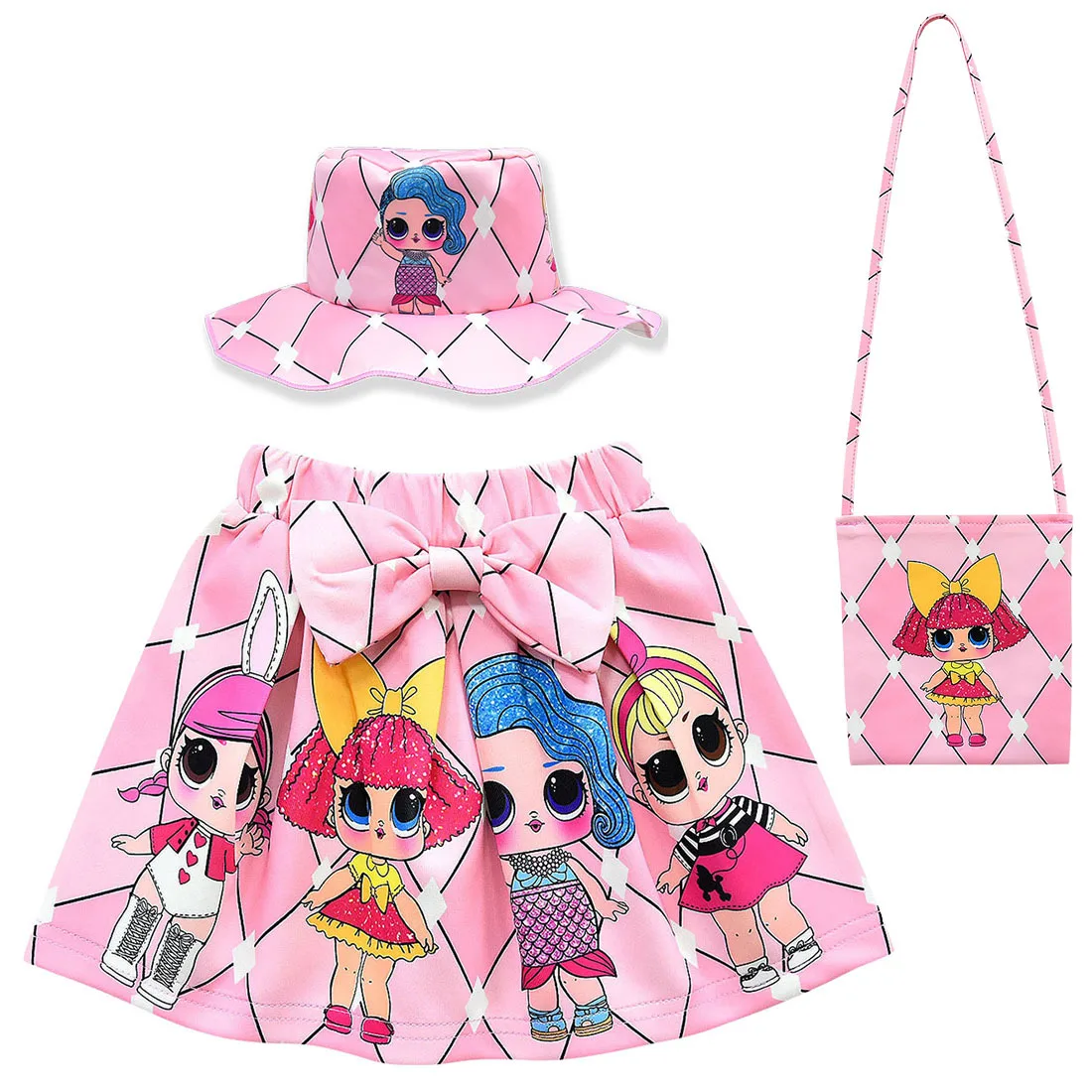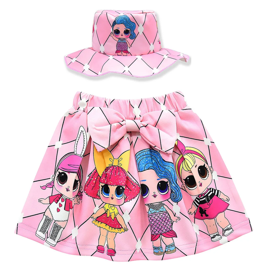 Комплект одежды для маленьких девочек, 4 предмета, топ с коротким рукавом + юбка + шапка, наряды, одежда с куклой и мультяшным принтом для девочек