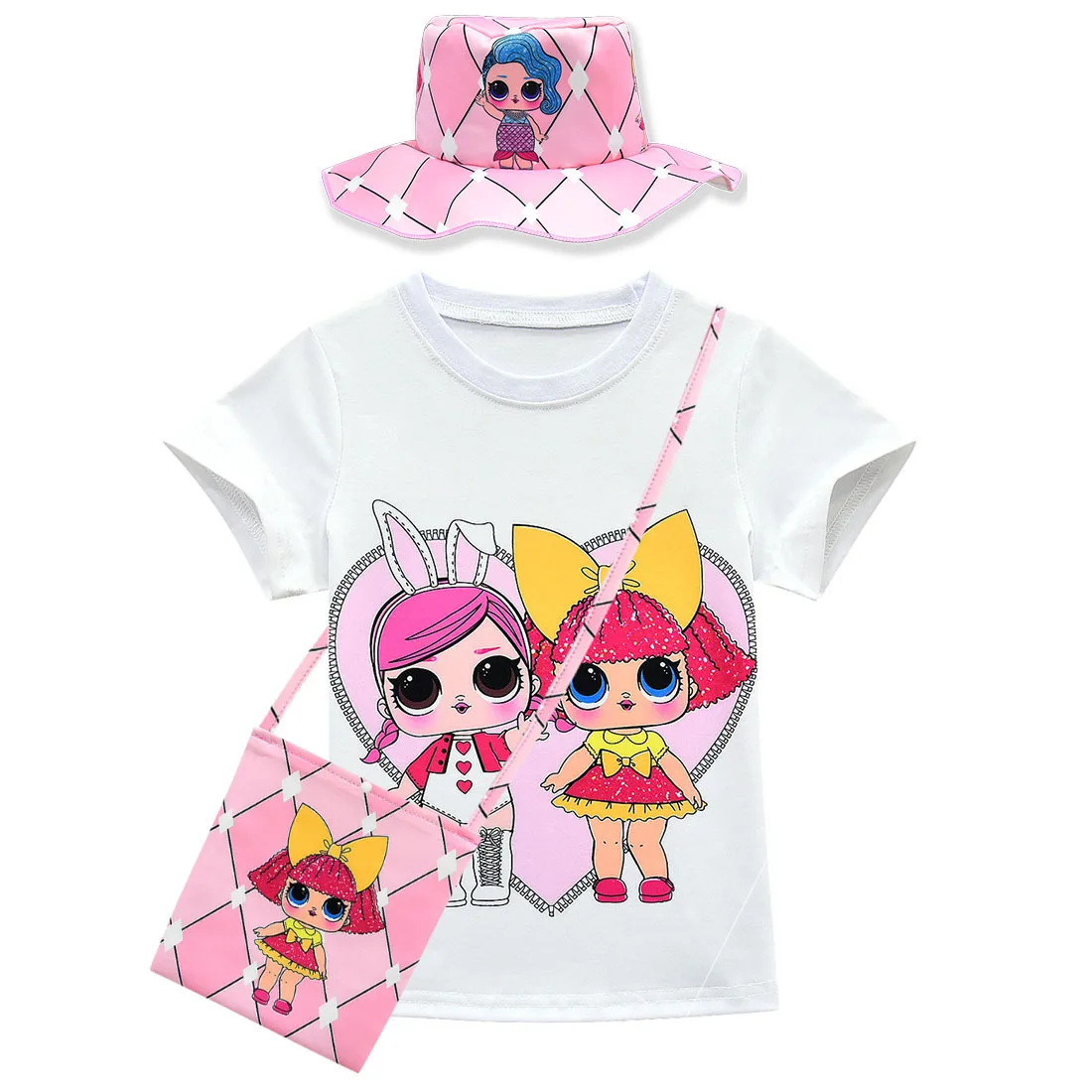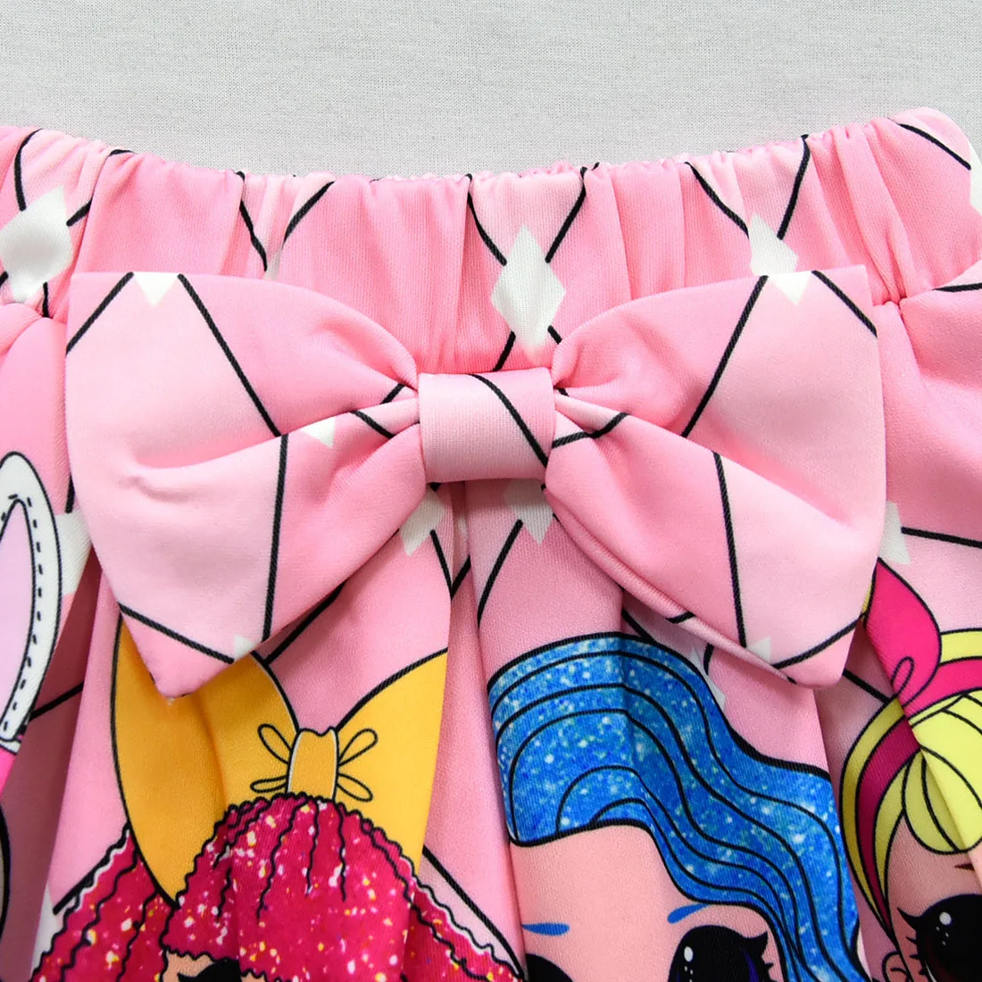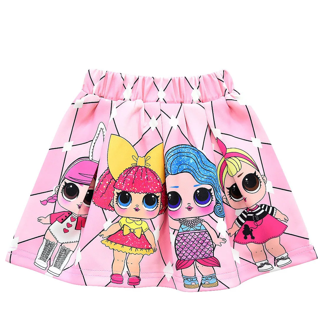 Комплект одежды для маленьких девочек, 4 предмета, топ с коротким рукавом + юбка + шапка, наряды, одежда с куклой и мультяшным принтом для девочек