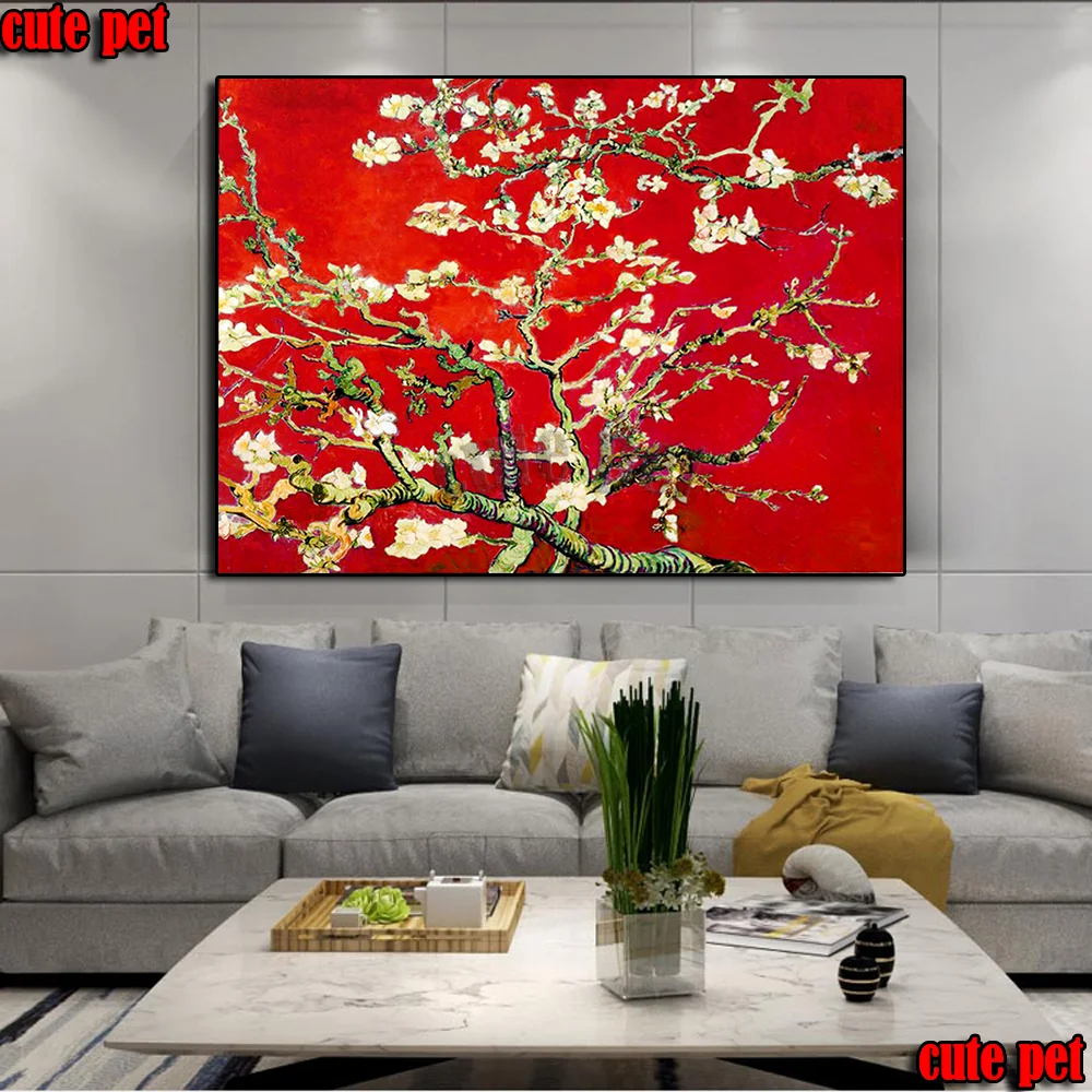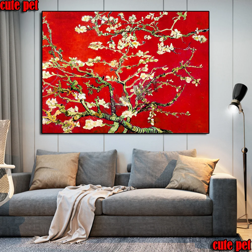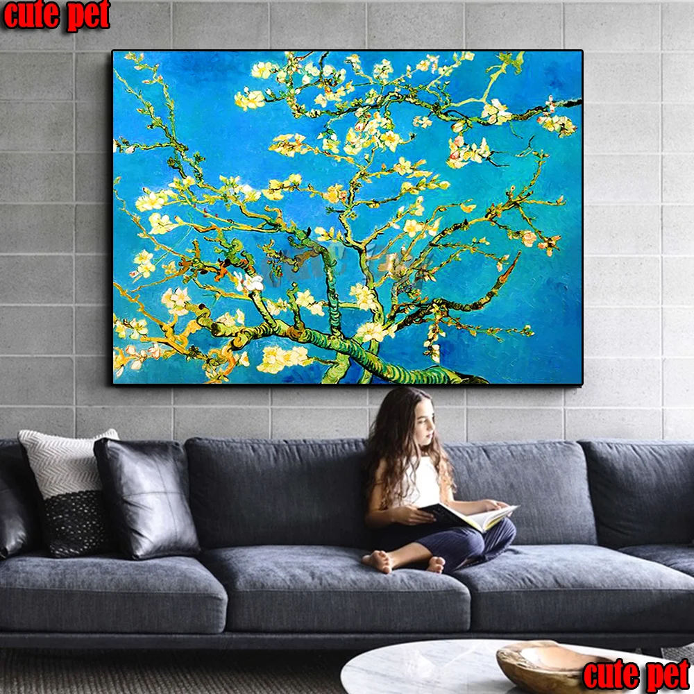 Алмазная 5D картина сделай сам, картина с интерпретацией цветущего миндаля, вышивка крестиком, цветами и ветками, мозаика для домашнего декора