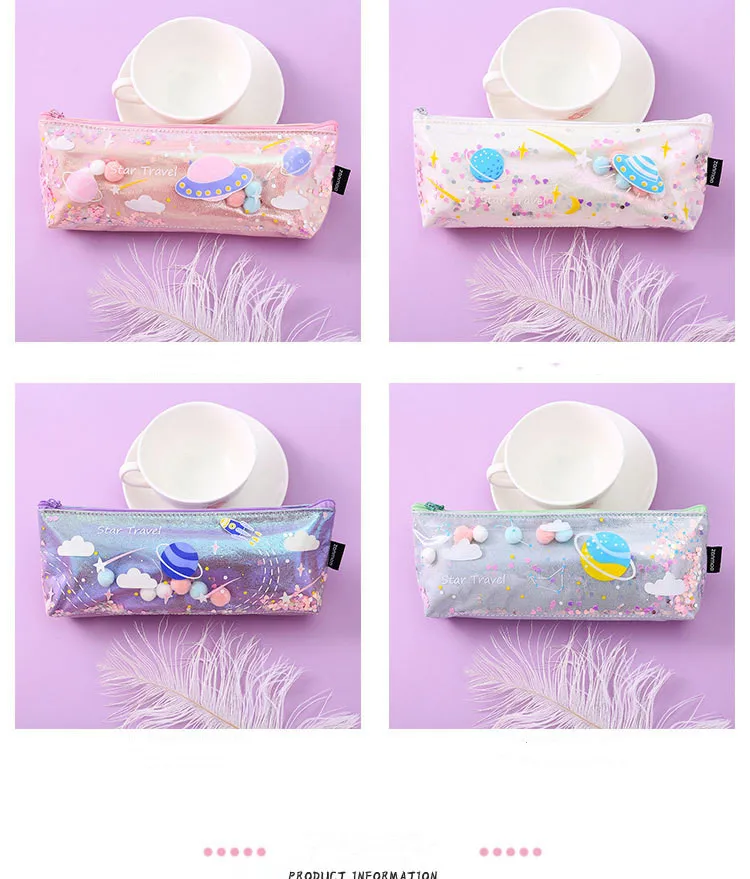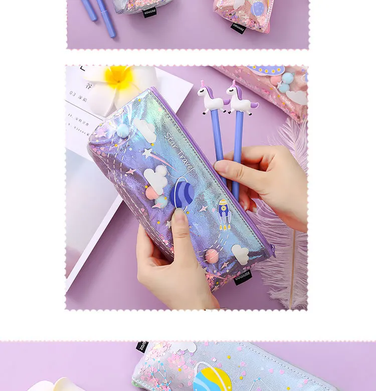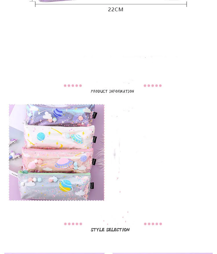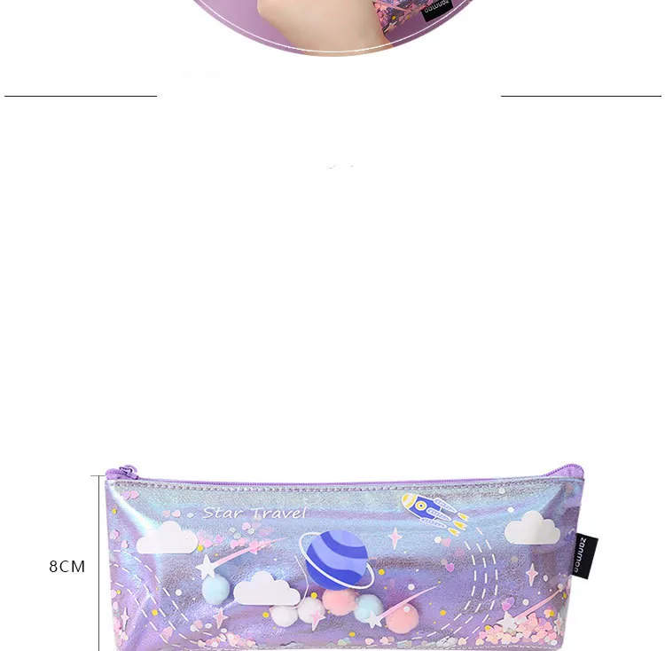 Цветной чехол-карандашБольшой чехол-Карандаш Размер: 19*13 смМаленький чехол-Карандаш Размер: 22*8 смРисунок: мультяшная планетаСтиль: 2 стиля sТвердость: мягкаяТолпа: подарки для девочек/студентовЦвет: фиолетовый/розовый/белый/серый