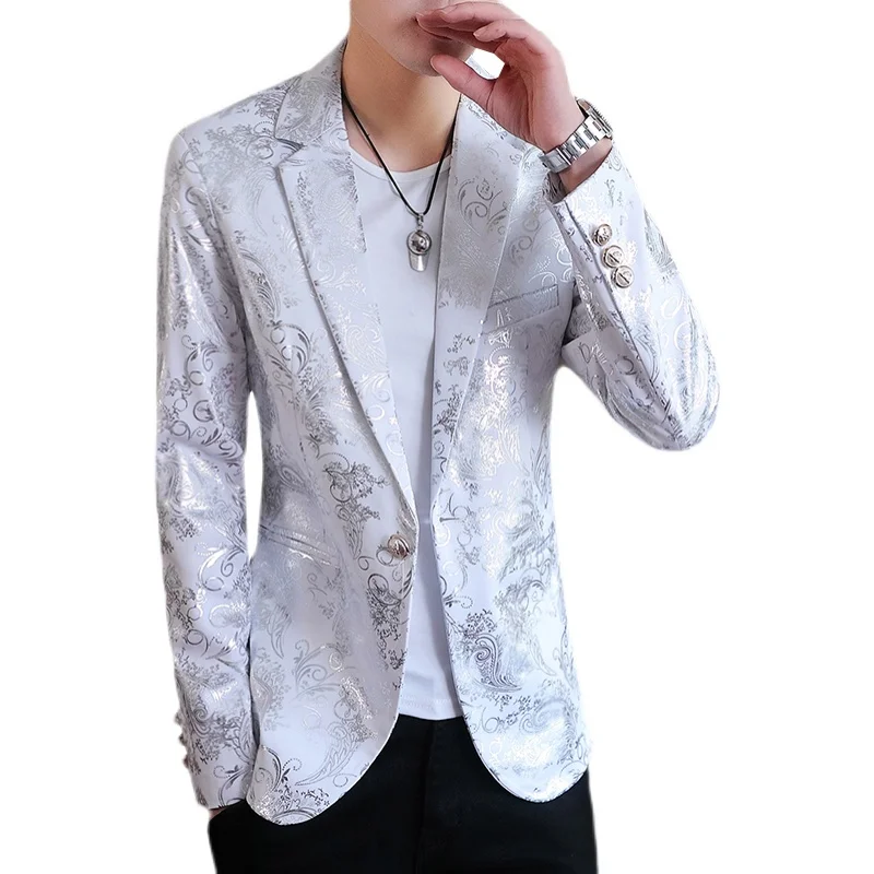 Мужской Блейзер, Новинка весна-осень 2021, высококачественный мужской однотонный костюм с золотыми цветами, на одной пуговице, приталенный мужской костюм с длинными рукавами