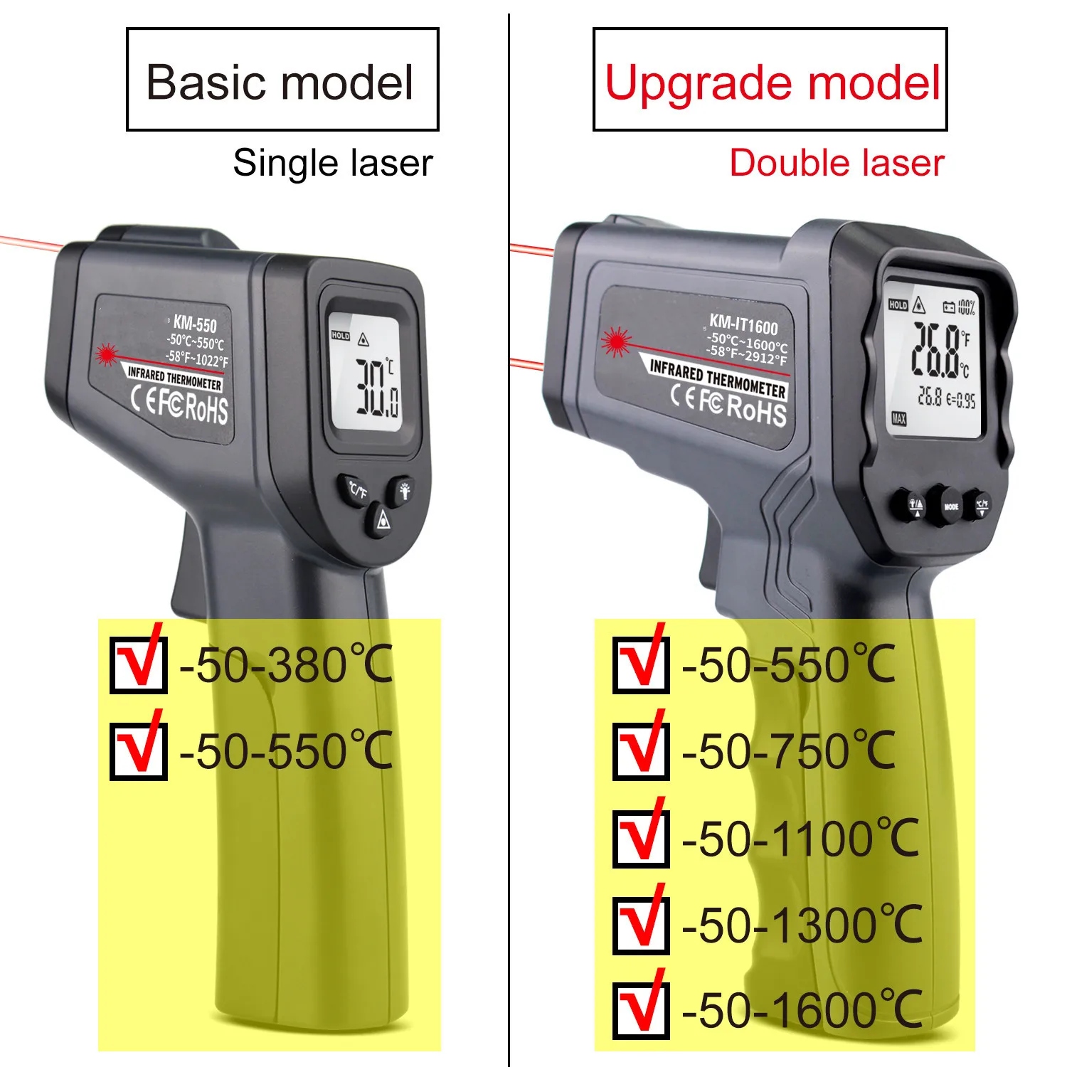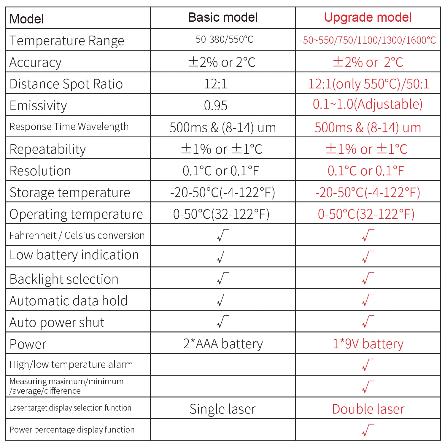【Измерьте максимум до 716 ℉ с высокой точностью 】диапазон температур: -50 ℃ ~ 380 ℃~ 716 ℉); Точность: ≥ 100 ℃, ± 2% / ≤ 100 ℃, ± 2 ℃; расстояние до места Размер: 12:1; Излучение: 0,95 (фиксированное); Время отклика: 0.5s, источник питания: 2 * AAA батареи.
