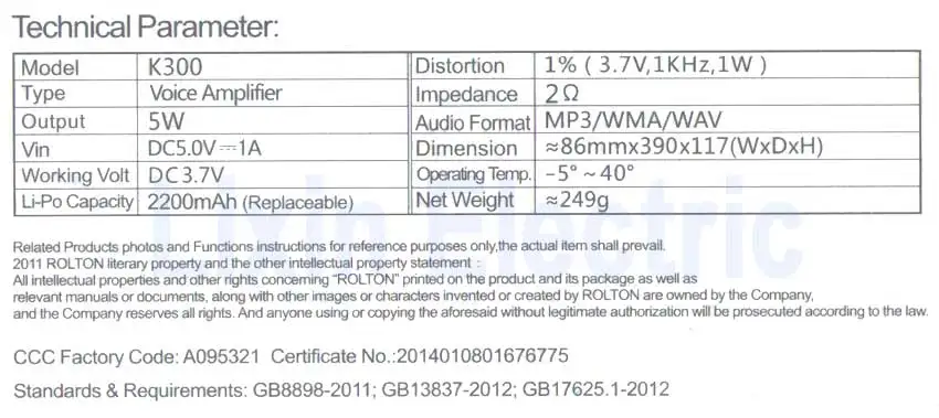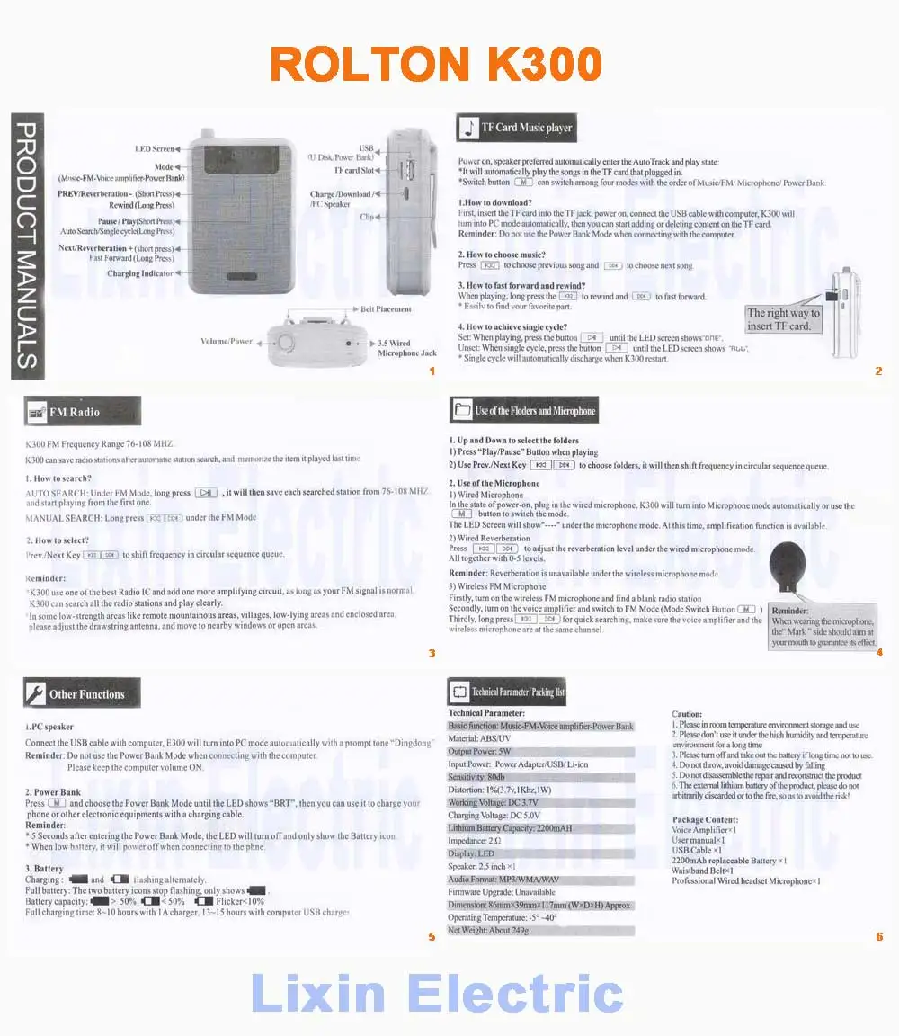 Внешний усилитель голоса Rolton K300, поддержка FM, TF, MP3