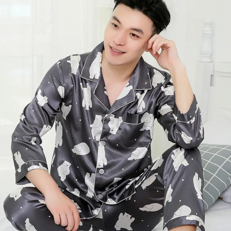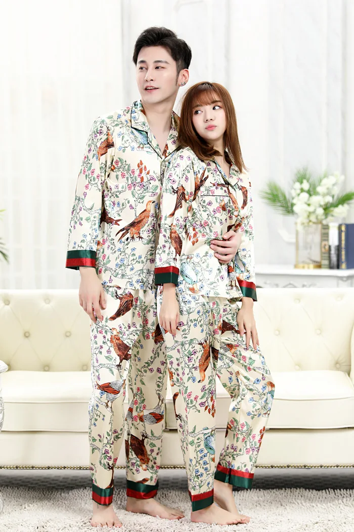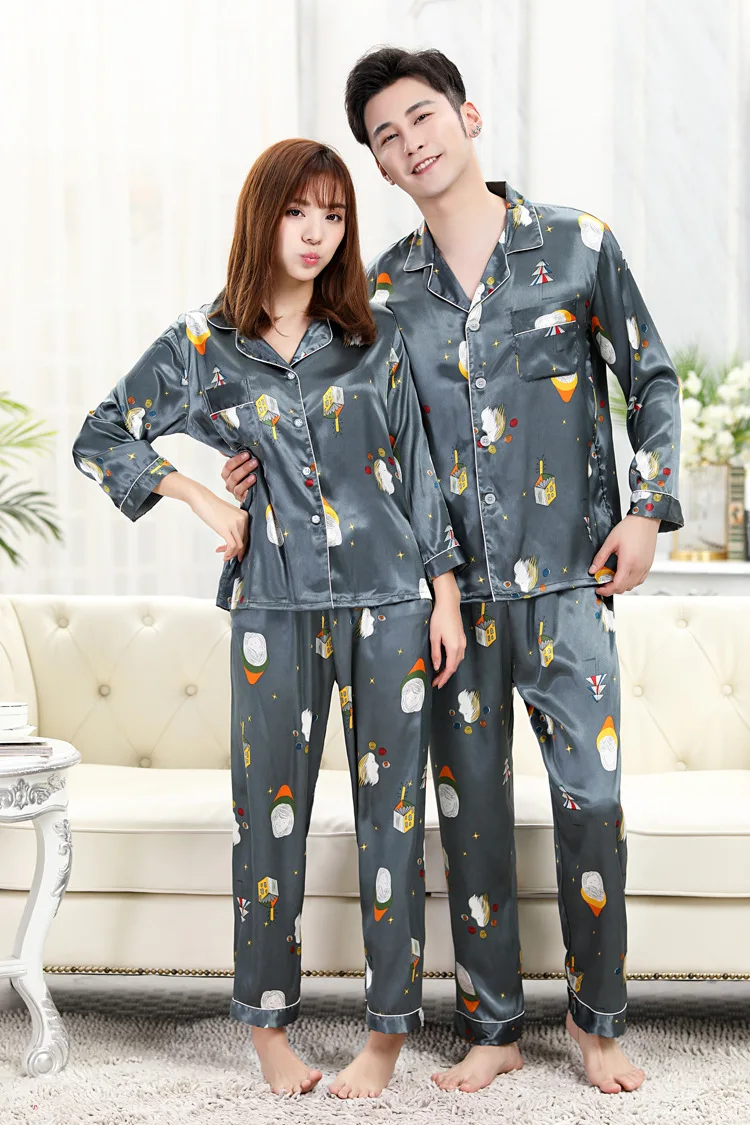 Пижама женская с принтом, одежда для сна с длинным рукавом, шелковая пижама для пар, топ и штаны, пижамный комплект