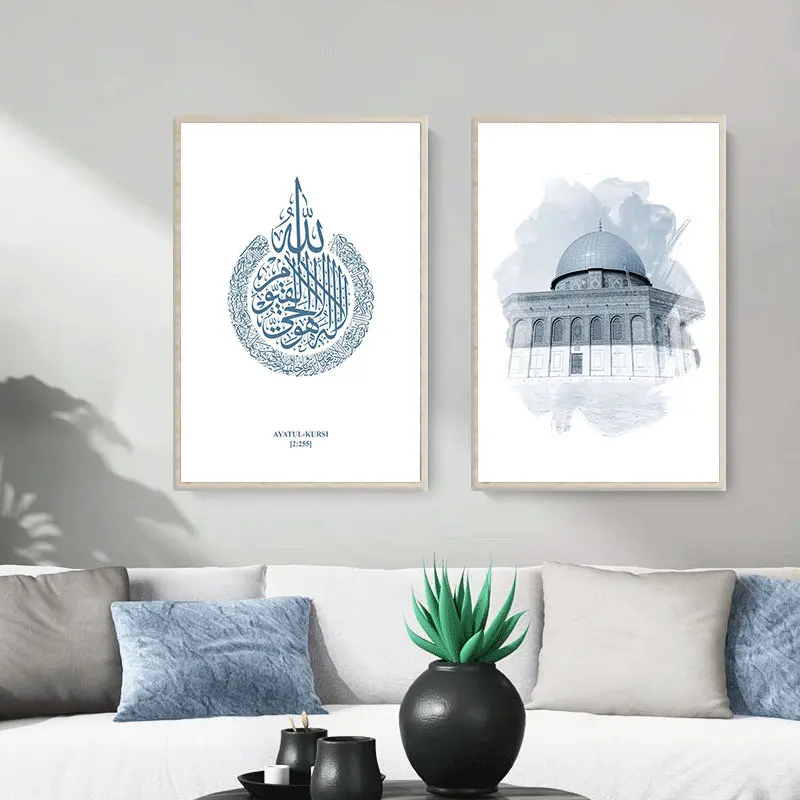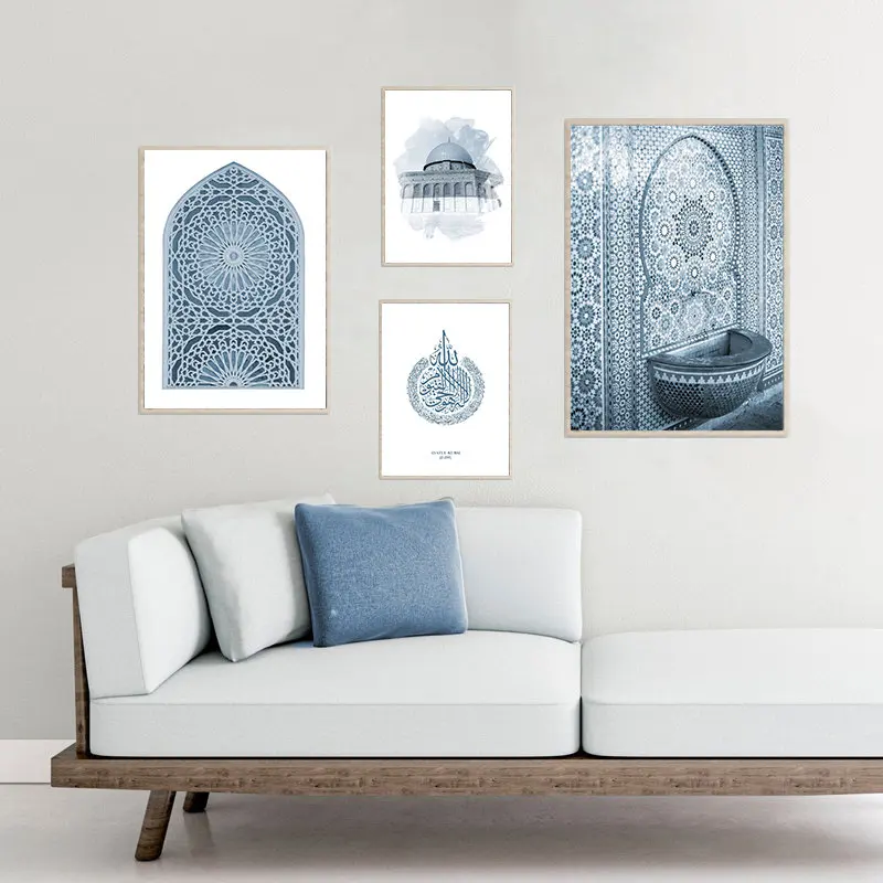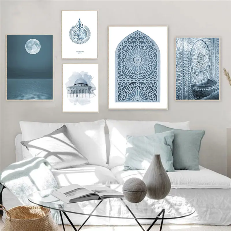 Современная Картина на холсте с изображением синих пионов, марокканских дверей, исламский Аллах мусульманских букв, Настенная картина для гостиной