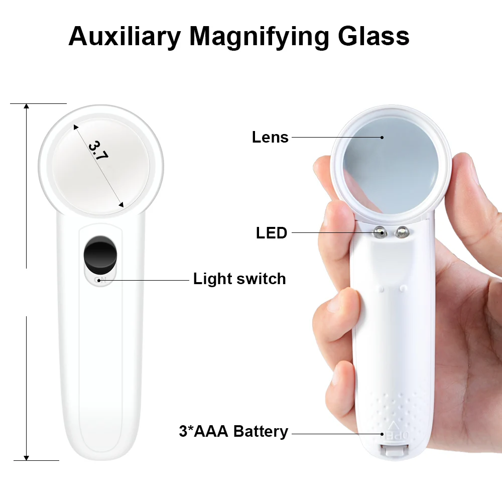 Особенность: 1. 15-кратное увеличение, облегчает чтение и просмотр деталей 2. Светодиодный светильник имеет достаточную яркость и может обеспечить лучший увеличительный эффект 3. Портативный и легкий, можно положить в сумку или карман, удобный для использования Описание товара: 1. 100% Новинка и высокое качество 2. Тип: стеклянная лупа 3. Материал: пластик + стекло 4. Размер: 13x4,5x2,6 см 5. Цвет: белый 6. Источник светильник: светодиодный 7. Питание от: 3 батареек типа ААА (не входят в комплект)