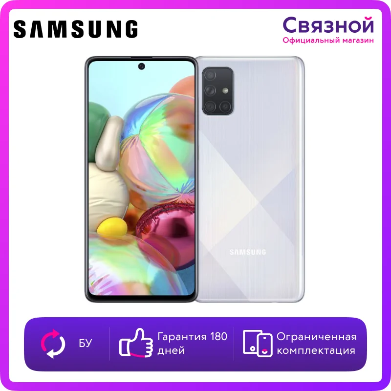 Обратите внимание: этот смартфон был в употреблении. В комплектацию входит только сам аппарат, без аксессуаров.Состояние отличное. Смартфоном пользовались аккуратно и непродолжительное время. Устройство исправно, все функции работают. Минимальные следы эксплуатации на корпусе. На смартфон предоставляется гарантия 180 дней.ЭКРАН БЕЗ ГРАНИЦ ДЛЯ МАКСИМАЛЬНОГО ПОГРУЖЕНИЯБезграничный 6.7-дюймовый sAMOLED Plus экран Samsung Galaxy A71 обеспечивает естественную цветопередачу изображения в любой момент: во время игр, при просмотре фильмов и серфинге в интернете. Наслаждайтесь эффектом максимального погружения во время всех своих любимых занятий.ДИЗАЙН, ПРОДУМАННЫЙ ДО МЕЛОЧЕЙСмартфон Samsung Galaxy A71 притягивает взгляд. Гладкие плавные линии корпуса позволяют комфортно держать его в руке, а уникальный дизайн задней панели с динамическим узором выделит вас из толпы. Подчеркните свою индивидуальность с одним из ярких призматических оттенков Черного, Серебряного или Голубого цвета.ЧЕТЫРЕ КАМЕРЫ ДЛЯ СЪЕМКИ В ЛЮБЫХ УСЛОВИЯХСнять объект крупным планом, сделать пейзаж, снимок в ночное время или потрясающий портрет с эффектом размытия - смартфон Samsung Galaxy A71 способен на все благодаря четырем AI-камерам: основной объектив на 64 Мп, сверхширокоугольная камера с углом обзора 123° на 12 Мп, 5 Мп камера для макросъемки и 5 Мп камера с датчиком глубины.СМОТРИТЕ НА МИР ШИРЕСнимайте мир во всей полноте красок с помощью сверхширокоугольной камеры 12 Мп. Объектив камеры позволяет фотографировать с углом обзора 123°, что аналогично зрению человека, благодаря чему у вас легко получится передать всю красоту панорамных снимков природы или городского пейзажа.МЕЛЬЧАЙШИЕ ДЕТАЛИ КРУПНЫМ ПЛАНОМ5 Мп камера для макросъемки (F=40мм) открывает невероятные возможности для снимков крупным планом. Выбирайте режим "Живой фокус" и регулируйте степень размытия фона, чтобы выделить главный объект съемки и запечатлеть его мельчайшие детали и оттенки.ДИНАМИЧЕСКАЯ СЪЕМКА НА ВЫСОКОМ УРОВНЕЗаписывайте видео профессионального качества с помощью сверхширокоугольной камеры Samsung Galaxy A71 и интеллектуального ПО. Режим суперстабилизации делает яркие и динамичные кадры более плавными, обеспечивая возможность съемки на уровне экшн-камеры во время ваших самых удивительных приключений.ЯРКИЕ ЭМОЦИИ, ЯРКИЕ СЕЛФИДобавьте новых красок в свои селфи. Фронтальная камера Samsung Galaxy A71 на 32 Мп гарантирует яркие и четкие снимки в высоком разрешении. Выделяйте себя и своих друзей на фотографии с помощью режима "Селфи-фокус" и яркие эмоции вам точно обеспечены.БУДЬТЕ ВСЕГДА НА СВЯЗИВ динамичном ритме жизни нужен смартфон, на который всегда можно положиться. Samsung Galaxy A71 обладает мощным аккумулятором на 4500 мАч, благодаря чему вы сможете играть, делиться файлами с друзьями или осуществлять стриминг видео на протяжении целого дня. А супербыстрая зарядка на 25 Вт позволит быстро зарядить смартфон, всегда оставаться на связи с важными людьми.МОЩНЫЙ СМАРТФОН ДЛЯ РАБОТЫ И РАЗВЛЕЧЕНИЙSamsung Galaxy A71 оснащен быстрым процессором и вместительным объемом памяти для хранения всего самого важного. Плавная и быстрая работа смартфона обеспечивается усовершенствованным восьмиядерным процессором и 6 Гб оперативной памяти. Встроенная память 128 Гб и возможность ее расширения до 512 Гб с помощью microSD карты позволит вам хранить еще больш