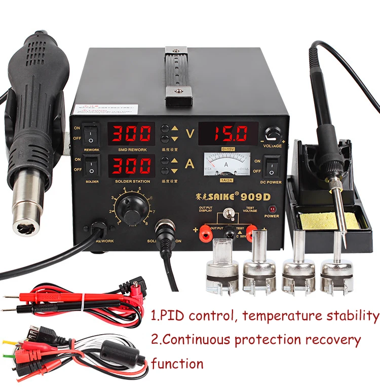 1, SAIKE909D основан на потребности рынка и спроектировал три в одном универсальном инструментальном оборудовании, которое объединяет в одном общем инструменте (сварочные наборы, пневматические пистолеты, мобильный телефон ремонт, блок питания), три функции можно использовать независимо или одновременно, занимает меньше рабочих поверхностей, полезность и энергосбережение, И в производительности одной функциональной продукции на рынке еще больше усилились.2. В изделии используется двухсторонний материал монтажной платы из стекловолокна. Аккуратно в процессе, поток сигнала чистый.3, железо, Воздушный пистолет и источник питания независимый двухъядерный микроконтроллер, и самый яркий, чтобы работать независимо, даже если возникают проблемы на пути, это не влияет на нормальную работу других двухъядерных процессоров, что значительно снижает процент отказов продуктов4, емкость вентилятора, регулируемый неполярный, железный, Температура воздушного пистолета, терминал отображения напряжения питания через светодиодный трехполосный дисплей5, железо, Воздушный пистолет с использованием интеллектуальных нечетких зон контроля температуры PID, стабильность температуры небольшой, температура компенсируется быстро, может адаптироваться к суровым условиям.6, Воздушный пистолет, паяльник с различной защитой от неисправностей;7, Силовая часть восстановления с непрерывной защитой и защитой RF, чтобы избежать помех всех видов неожиданного феномена сжигания мобильный телефон8, продукт может не только поддерживать питание как мобильный телефон, мобильный телефон также может обнаруживать силу радиочастотного сигнала, а через светодиодный индикатор показывает силу радиочастотных сигналов9, продукт прост в эксплуатации без кнопки переключения, когда закончен.