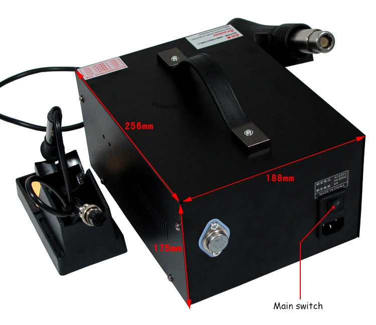 Технические параметрыМашина:Номинальное напряжение: переменный ток: 220 В ± 10% 50 ГцОбщая мощность: 700 Вт + 50 Вт + 15 Вт = 765 Вт ± 10% (макс.)Рабочая среда: 0-50 ° cТемпература хранения: -20-80 °CЖелезные детали:Выходное напряжение: переменный ток: 26V ± 10%Выходная мощность: 50 Вт ± 10%Диапазон температур: 200 -480 ° cСтабильность температуры: ± 2 °CУстойчивость к заземлению <2 ОмНапряжение от кончика до заземления <2МВЧасти пистолета горячего воздуха:Рабочее напряжение: переменный ток: 220 В ± 10% 50 ГцВыходная мощность: 700 Вт ± 10%Диапазон температур: 100 -480 °CСтабильность температуры: ± 2 °C