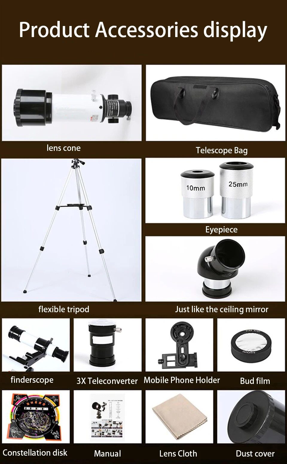 1 х телескоп1 окуляр 10 мм1 окуляр 20 мм1x5x24 видоискатель1x1,25 дюйма 3X линза Барлоу1 х Алюминиевый Штатив1 х пылезащитный чехол1 х Ткань для линз1 х диск созвездия1 х Руководство пользователя1 х сумка для телескопа1 x солнцезащитный фильтр1 х держатель Мобильный телефон