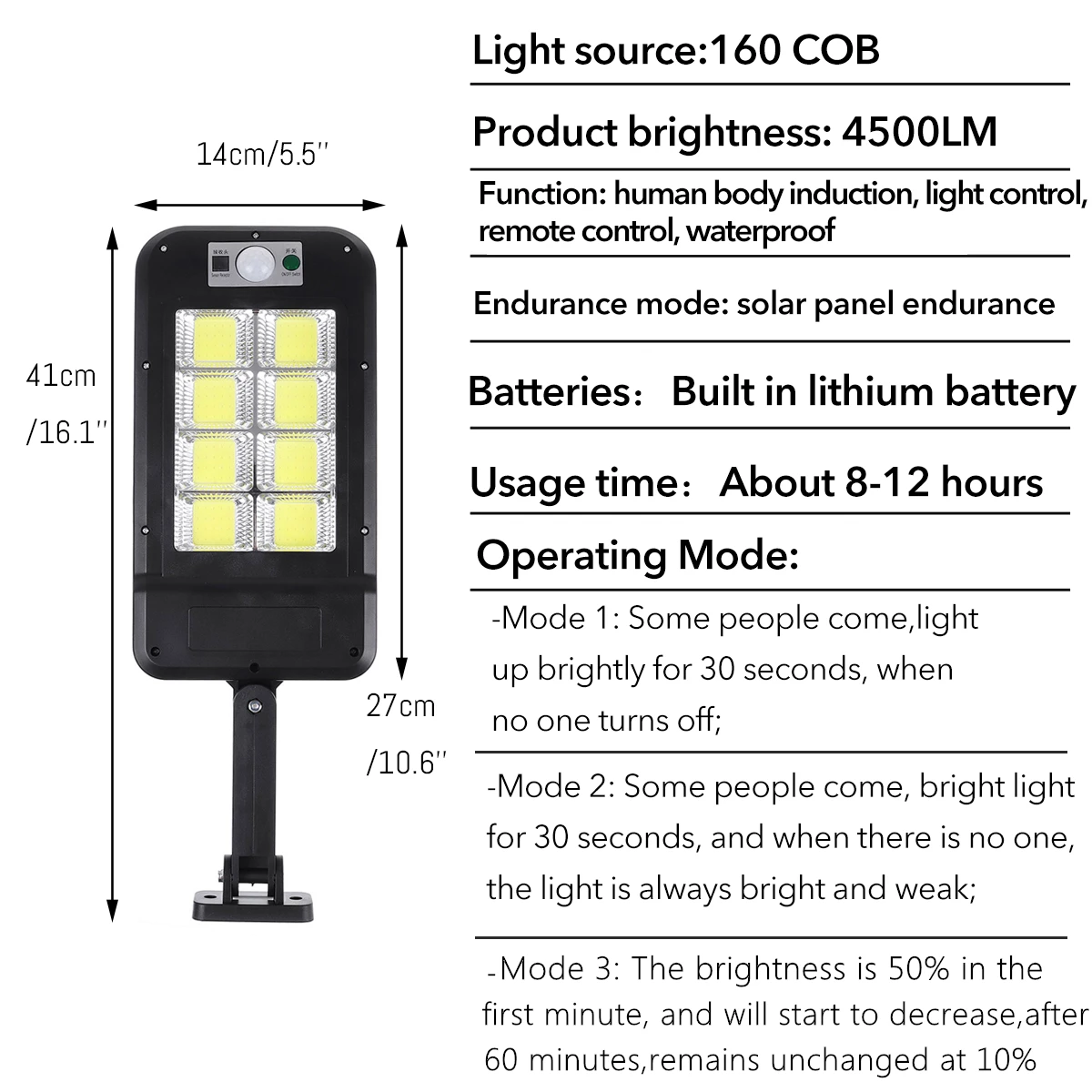 Посылка входит:1 шт.:Светильник1 пульт дистанционного управления1 x крепежные винтыСпецификация:Название продукта: светильникРазмер: 41x1 см/16.1x5.5 дюймовЦвет: черныйМатериал: черный акрил + АБС-пластикШарик лампы: 160xCOBБатарея: встроенная аккумуляторная батареяСолнечная панель: 5,5 В/1,5 ВтРабочее напряжение: 5 ВРасстояние индукции: 5 мОсобенность:-Пульт дистанционного управления и регулируемая поддержка, этот наружный светодиодный солнечный светильник имеет классический регулируемый кронштейн, который позволяет регулировать угол воздействия солнечной лампы в соответствии с рабочей средой. Кроме того, пультом управления вам удобнее Настроить Рабочий режим светильника в любой момент, вам не придется полЬзоватЬся лестницей.-Светодиодный более яркий и более широкий свет, светильник с датчиком движения на солнечной батарее оснащен модернизированными высококачесветодиодный ными светодиодными лампами и новейшим чипом управления энергией, что увеличивает угол и площадь освещения на 50%.-Три удобных режима, по сравнению с другими однорежимными солнечными фонарями, уличные фонари на солнечных батареях обеспечивают 4 режима работы, чтобы справиться с различными сценариями использования. Индукционный режим, режим энергосбережения и режим полной светильник ности. Идеально подходит для использования на входной двери, дворе, саду, крыльце, гараже, подъездной дорожке, палубе, дороге, ферме и любом месте, где светит солнце.-Всесесветильник, светодиодный светильник поглощает и преобразует светильник в электричество, эффективная солнечная панель имеет хорошую теплостойкость и водонепроницаемость IP65 и может продолжать работать в холодные зимние месяцы, светильник свою жизнь в любую погоду и любой сезон.-Сверхдлительный срок службы, светильник на солнечных батареях водонепроницаем IP65, что полностью защищает цепь и аккумулятор и продлевает срок службы в 2 раза по сравнению с другими.