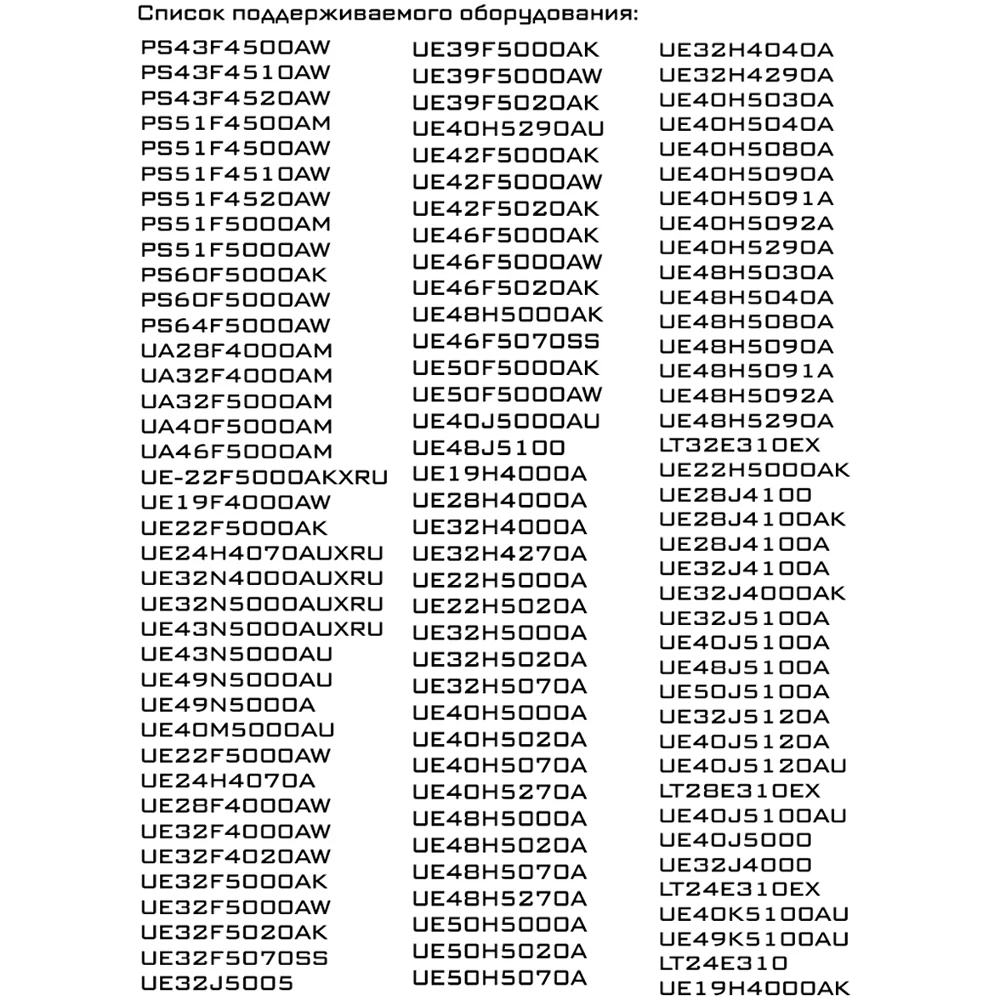 Как выбрать пульт?Если в списке поддерживаемого оборудования указана Ваша модель - в большинстве случаев это гарантирует совместимость пульта и телевизора. Если же в списке нет вашей модели ТВ, но пульт внешне схож с вашим на 100%, это так же означается что пульт будет совместим. Вы всегда можете задать нам вопрос, мы с удовольствием проконсультируем Вас по совместимости.
