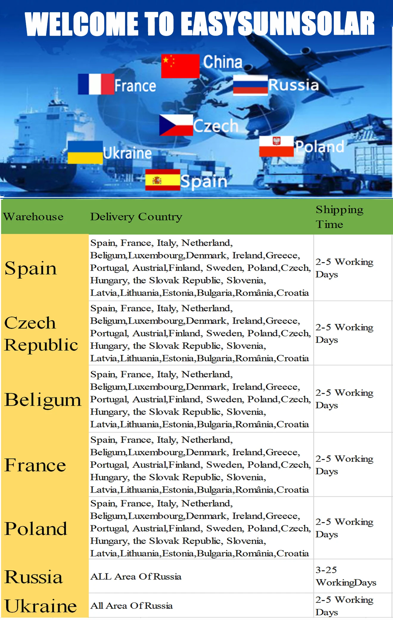 1. Для европейских стран Memeber клиент: отправка из Испании, Чехии, белигума, Франции или Польши со склада, 2-7 рабочих дней Доставка через DHL, Correos, GLS или PPL.2. Для России: Доставка со склада в Москву, быстрое прибытие через Почту России.3. Клиент для Украины: доставка со склада Украины, быстрая доставка