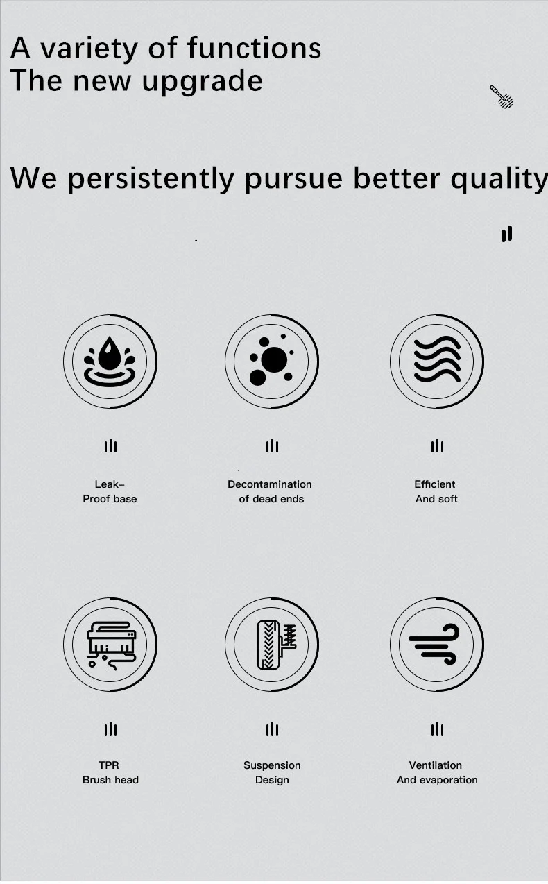 > Мягкая резиновая головка щетки, толстая головка щетки, сильная адсорбционная сила, Эффективное обеззараживание, очистка после смыва.
