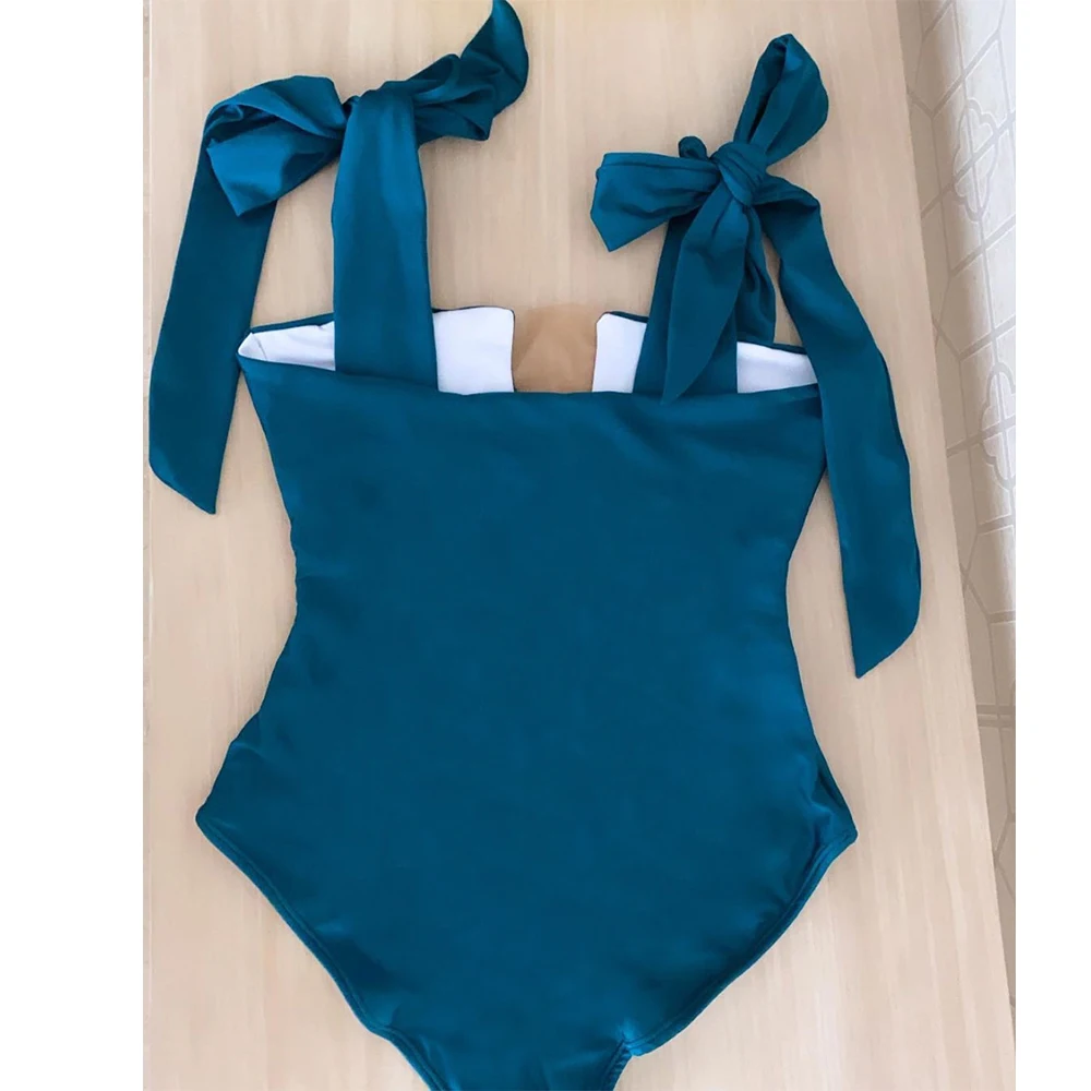 Слитный купальник с бантом 2022, сексуальный однотонный синий купал...