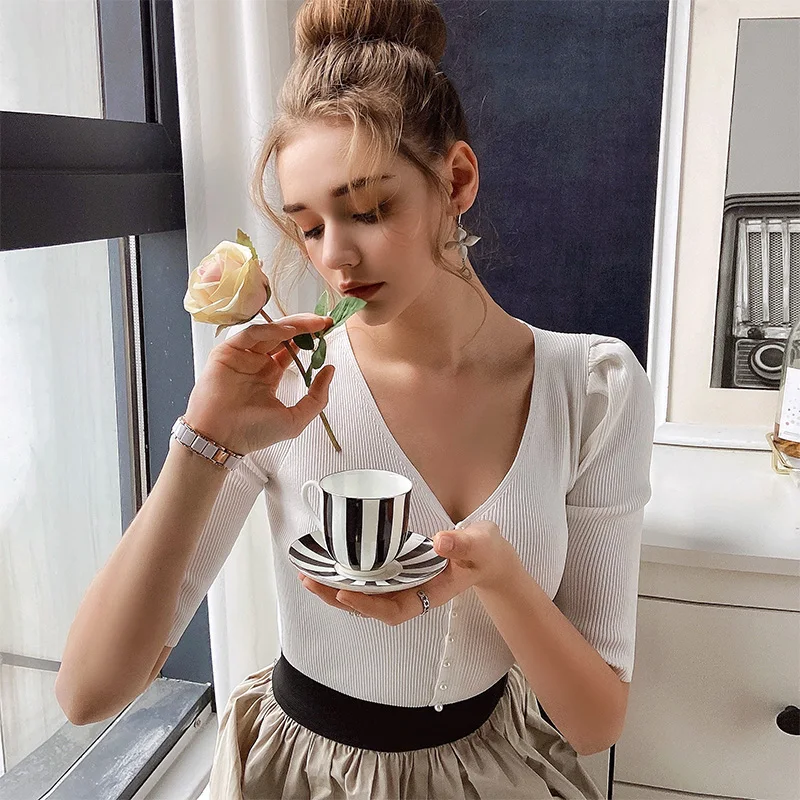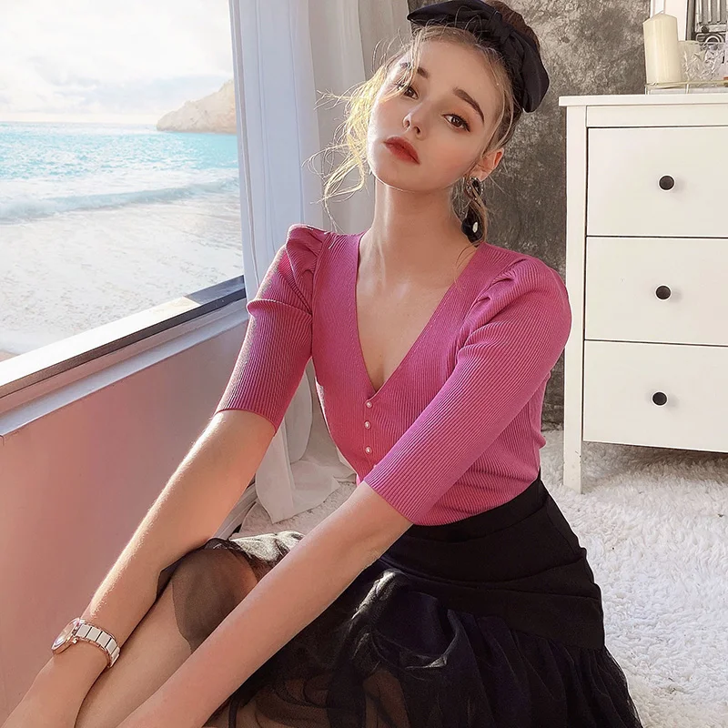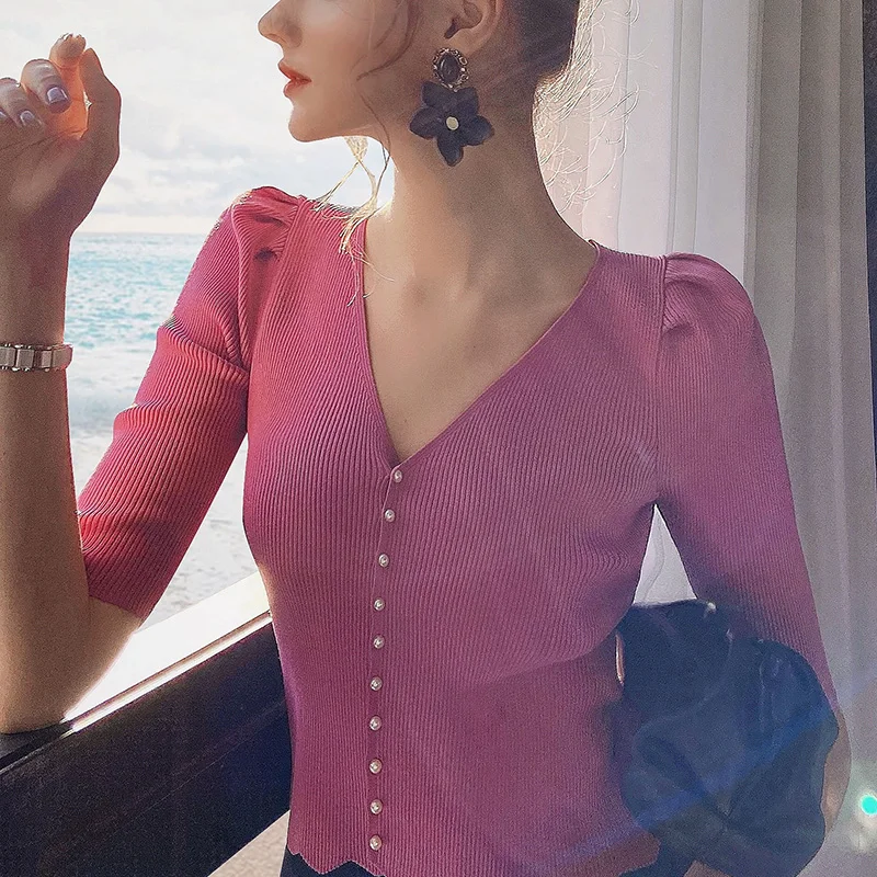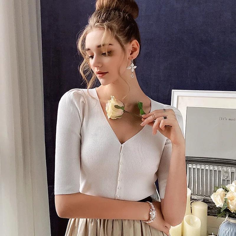 Свитер женский однобортный с V-образным вырезом и полурукавами, DO1AJS002