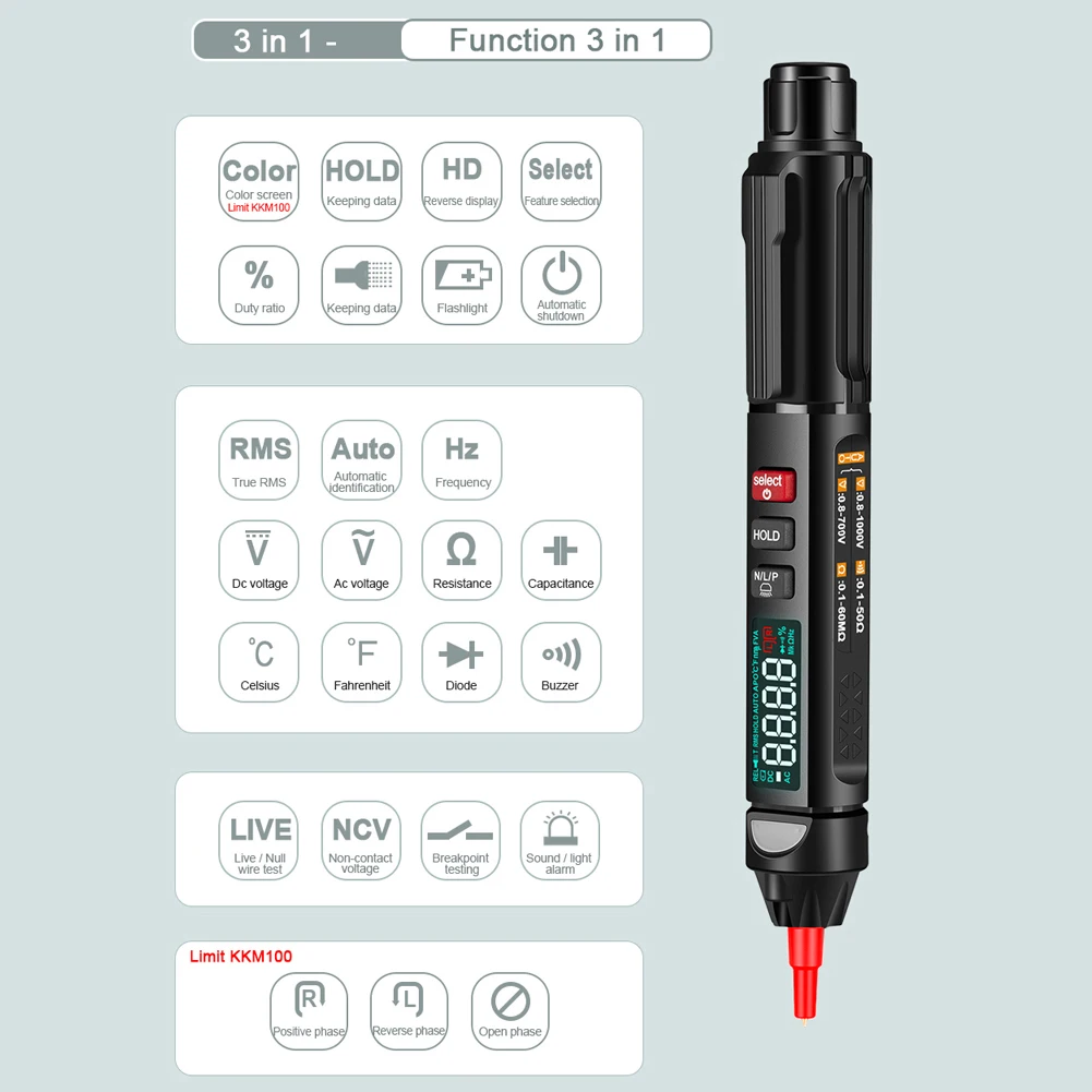 Этот инструмент представляет собой ручной Интеллектуальный мультиметр, нет необходимости поворачивать циферблат для выбора функции, в соответствии с входным напряжением/сопротивлением/разницей, счетчик будет автоматически определять и измерять, стабильная работа этой машины, высокая точность, высокая надежность, четкое считывание, функция перегрузки pro-tection, Давайте попробуем, это не подведет.Особенности:Он небольшого размера и легко носить с собой, вы даже можете положить его в карман, чтобы носить его куда угодно.Это не только мультиметр, но и ручки для тестирования напряжения, для типа kkm100, он также имеет функцию измерения последовательности фаз, которой нет у kkm99.Kkm99 с положительным дисплеем, а kkm100 с цветным экраном, вы можете выбрать тип, который вам нравится.Широкое применение: измеритель инструментов с отличной производительностью, полезный инструмент для лабораторий, заводов, радиолюбителей и членов семьи.Эта серия измерителей может автоматически определять напряжение постоянного тока, напряжение переменного тока, сопротивление без переключения, а также может быть вручную переключена для измерения емкости, диода, проверки целостности цепи, бесконтактное измерение напряжения, измерение линии нулевого напряжения и другие параметры.Функция автоматического отключения, без каких-либо действий в течение 5 минут, автоматическое отключение.Характеристики:Материал: АБСЦвет: черныйТип: kkm99, kkm100 (опционально)Питание: 1 батарейка AAA (не входит в комплект)Напряжение тока цифры: 0,8 ~ 1000 вНапряжение переменного тока: 0,8 ~ 700 вСопротивление: 0,1 ~ 60 МОмЕмкость: 10 нФ ~ 60 МФЧастота: 1 Гц ~ 10 МГцТемпература: -20 ℃ ~ 50 ℃(0 ℉ ~ 122 ℉)Диод: 3,0 вЗуммер: 0,5 ~ 5ΩЦвета: только kkm100Последовательность фаз: только kkm100Посылка: 171*21*21 мм/6,7*0,8 * 0.8inВес посылка: 80 г/2,8 унцииУпаковочный лист:1 * мультиметр (опционально)