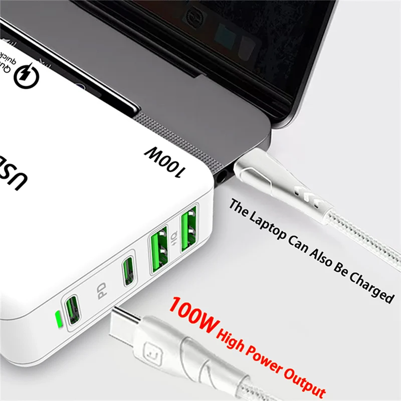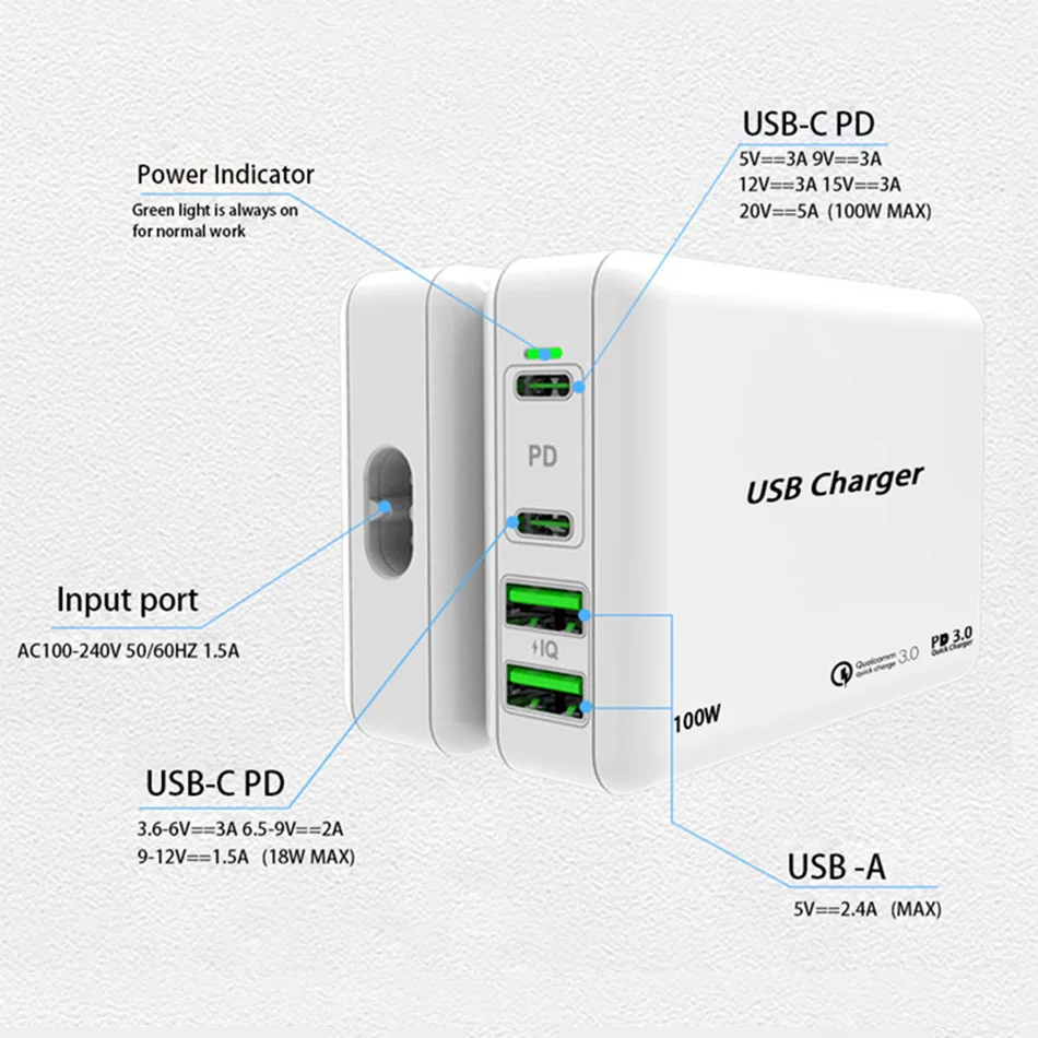 Зарядное устройство TQUQ, 4 порта, 100 Вт, USB-C PD, двойной адаптер питания USB мобильный телефон, для Macbook Pro, iPhone 12, Xiaomi, Huawei, Samsung