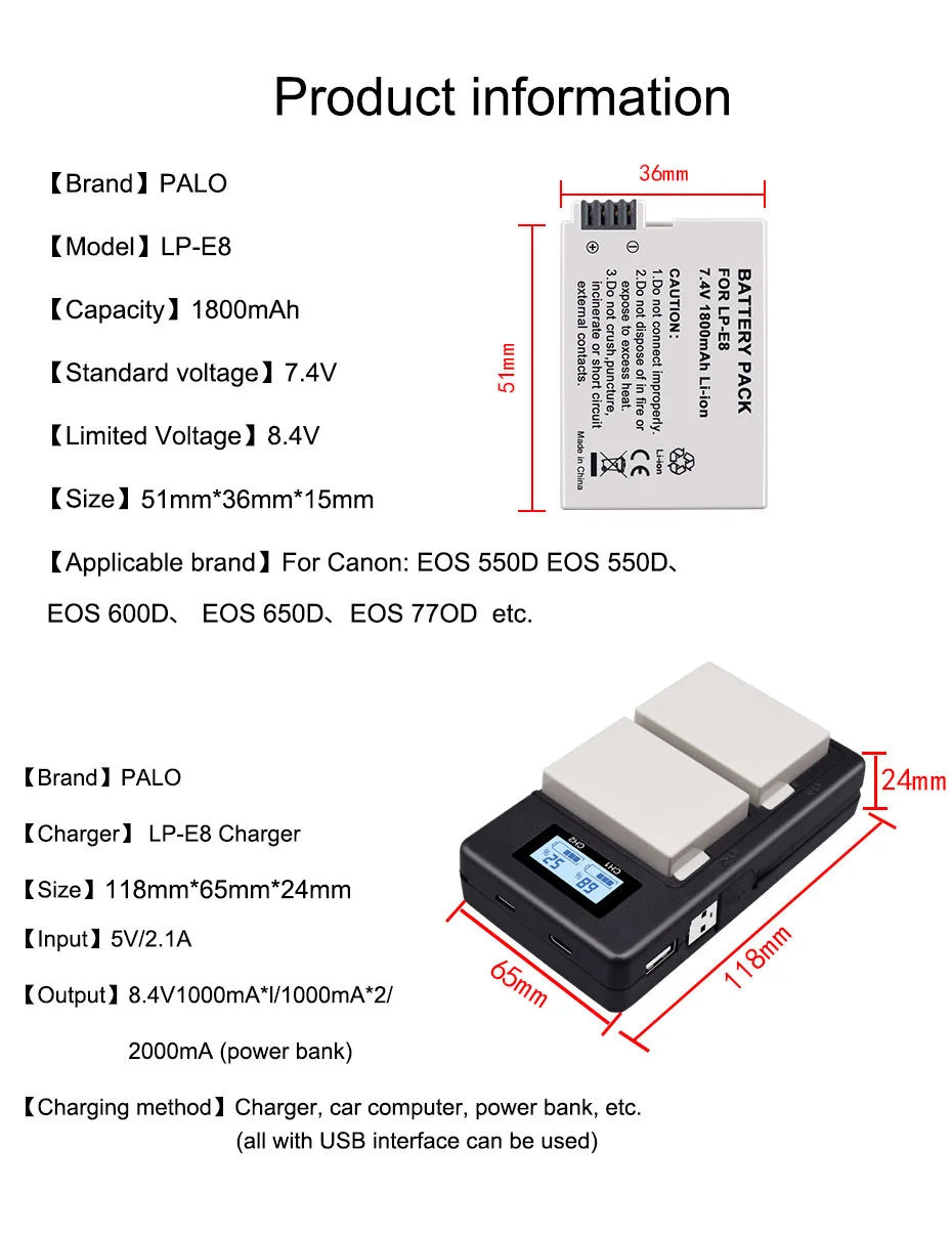 Обновленная версия:Емкость аккумулятора составляет 1800 мА · ч, а мощность полная.Качество изготовления, стабильный источник питания и непрерывная мощность.Зарядное устройство поставляется с кабелем, скрытым хранилищем и более удобной зарядкойВыходной порт usb может использоваться в качестве аварийного источника питания для зарядки мобильный телефон.Особенности продукта:Высокая емкостьСкрытый зарядный кабельЖК-дисплейСокровище аварийной зарядкиМногофункциональная зарядка Совместимая модель:Для Canon : EOS 550D / EOS 600D / EOS 650D / EOS 700D /X4 / X5 / X6i / X7i / T2i / T3i / T4i / T5i и т. д.